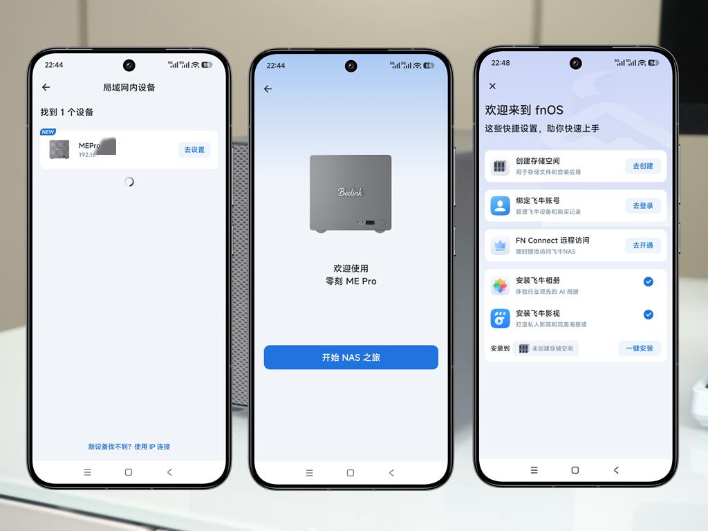 零刻ME Pro的初始设置过程也非常简单,完全可以说是“傻瓜式”操作。简单概括:通电、连接网线后--在飞牛APP上找到局域网内设备--设置管理员账号--创建磁盘阵列,然后再绑定飞牛账号、开通FN Connect远程访问,以及一键安装飞牛相册、飞牛影视,全程不到10分钟就搞定,不是一般的省事,即便是小白用户也不用有任何的操作压力。