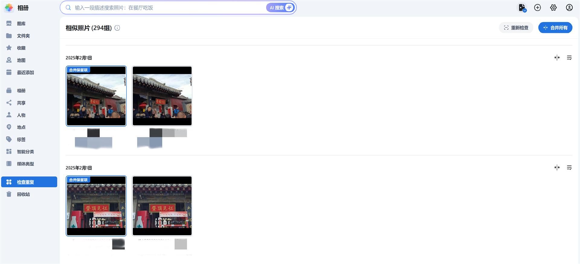要是懒得一张一张处理,“合并所有”功能,一键下去,系统会自动给每组重复照留一张最优的,其余的全移去回收站,最关键的是保留的那张还能继承其他重复照的收藏、描述、标签和所在相册数据,相当于清理垃圾的同时,还帮你把照片的相关信息都整合好了。