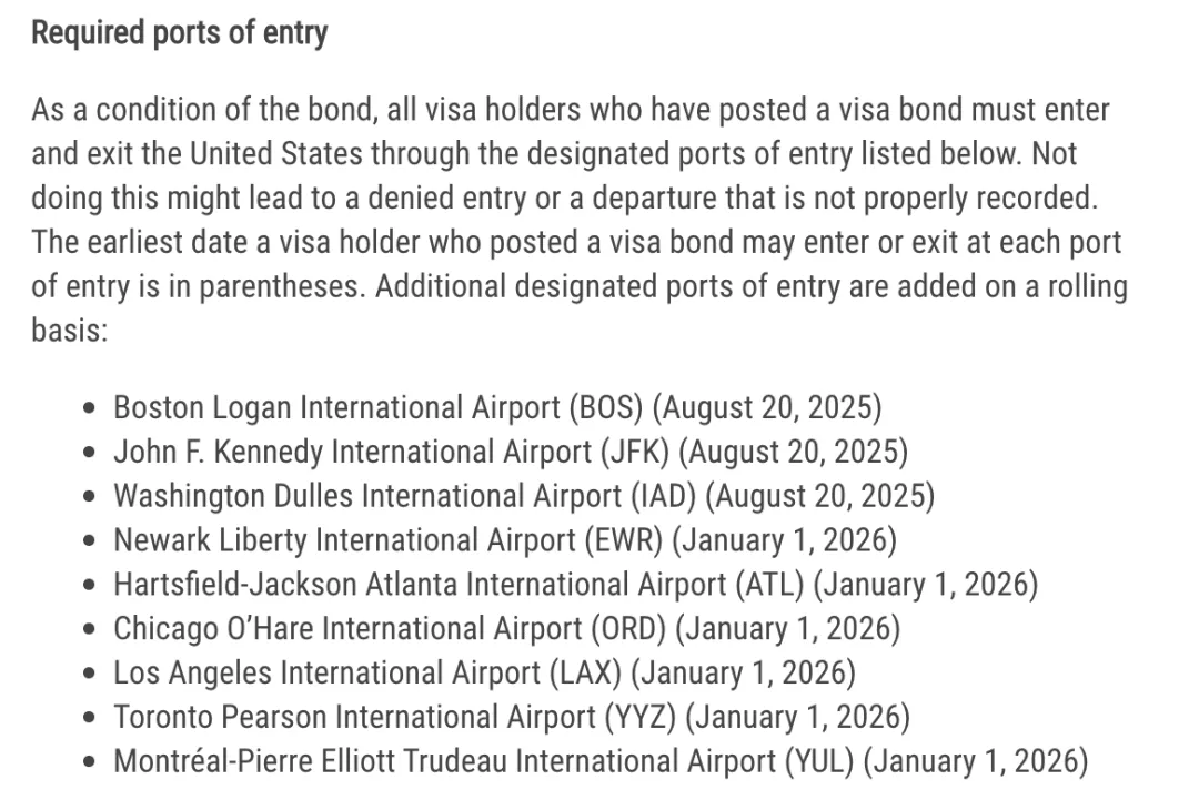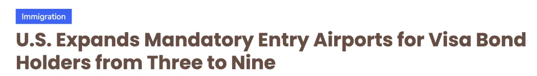 美国国务院近日宣布,对签证保证金(Visa Bond)制度作出重要调整:原本仅限三个机场的强制入境规定,正式扩展至九个指定国际机场。