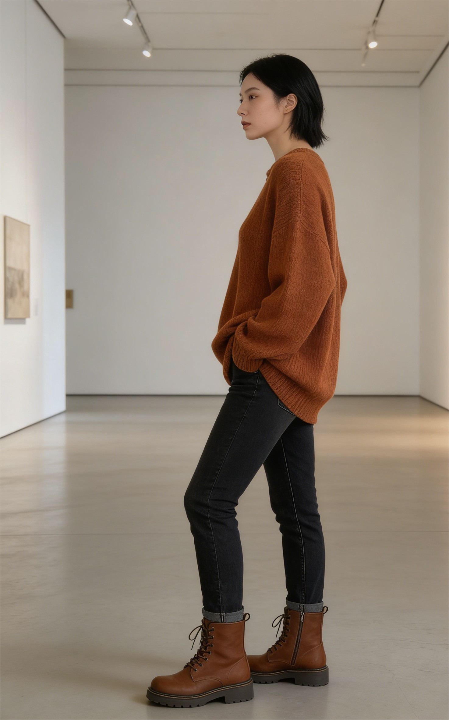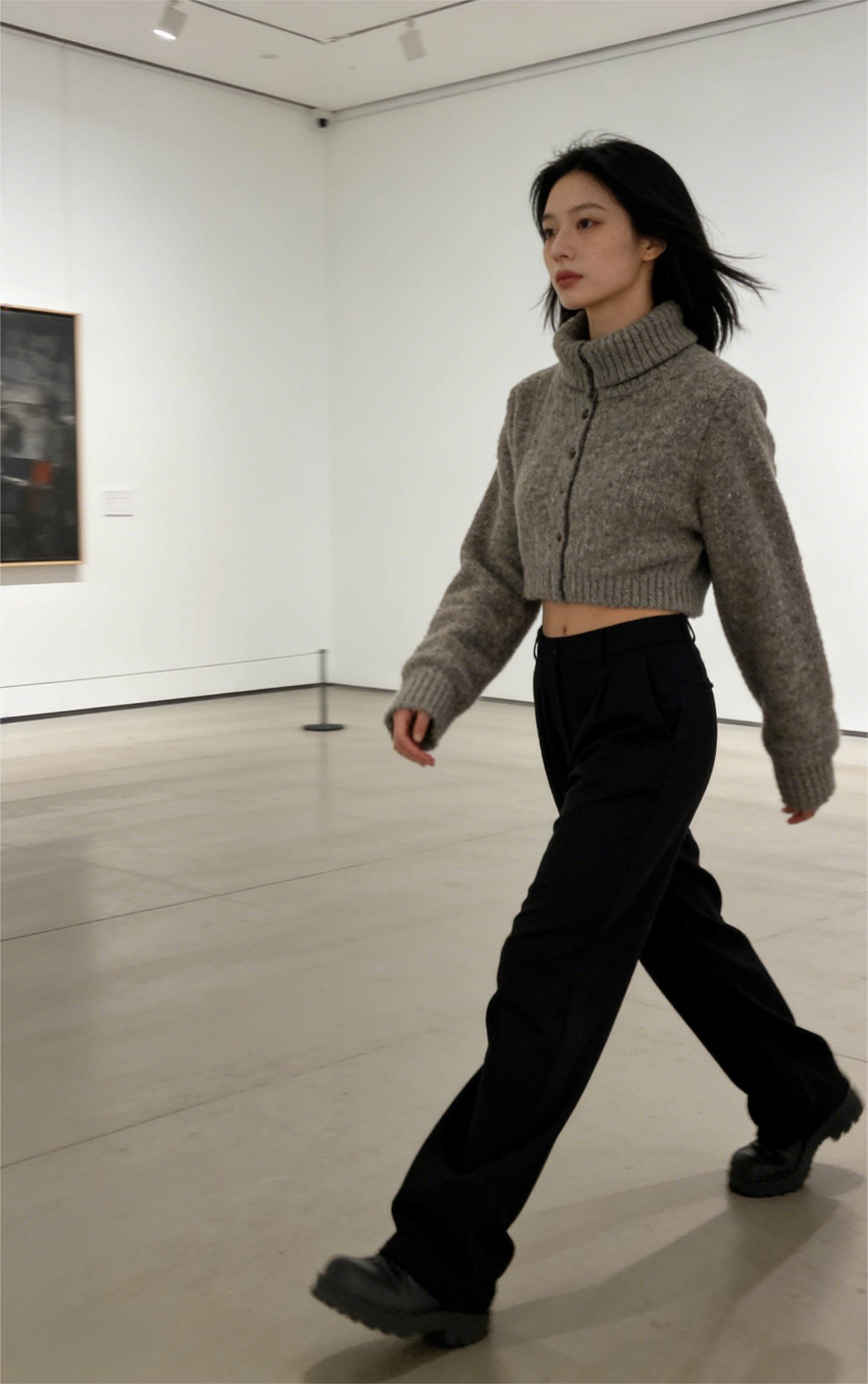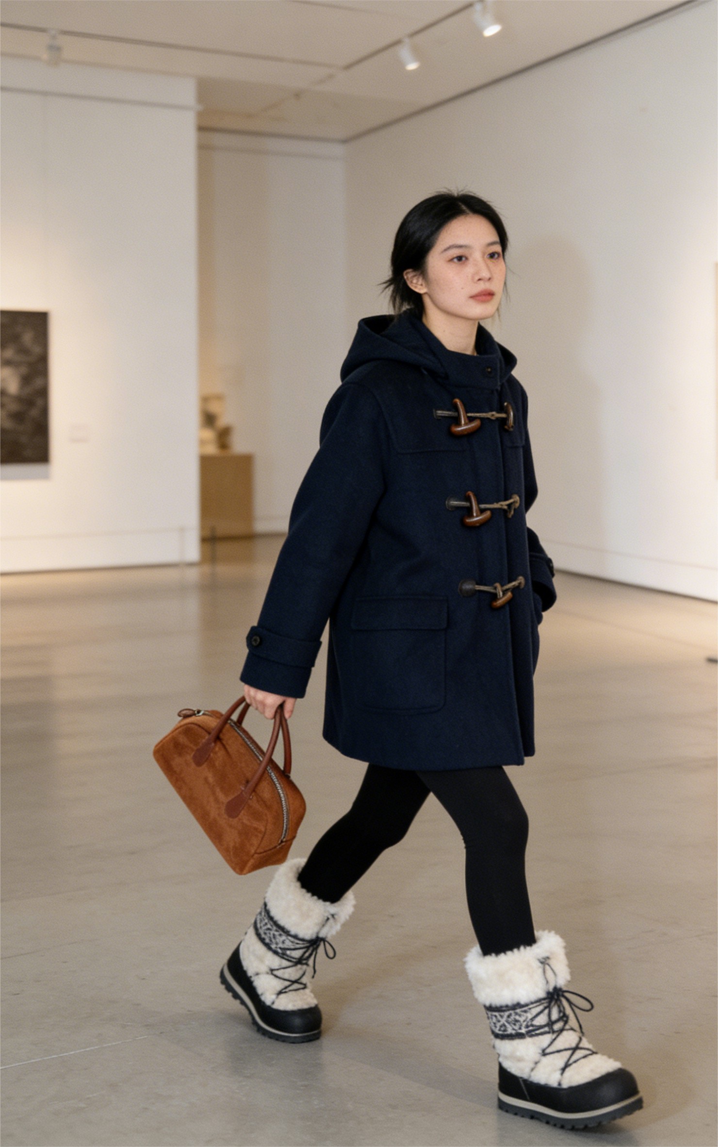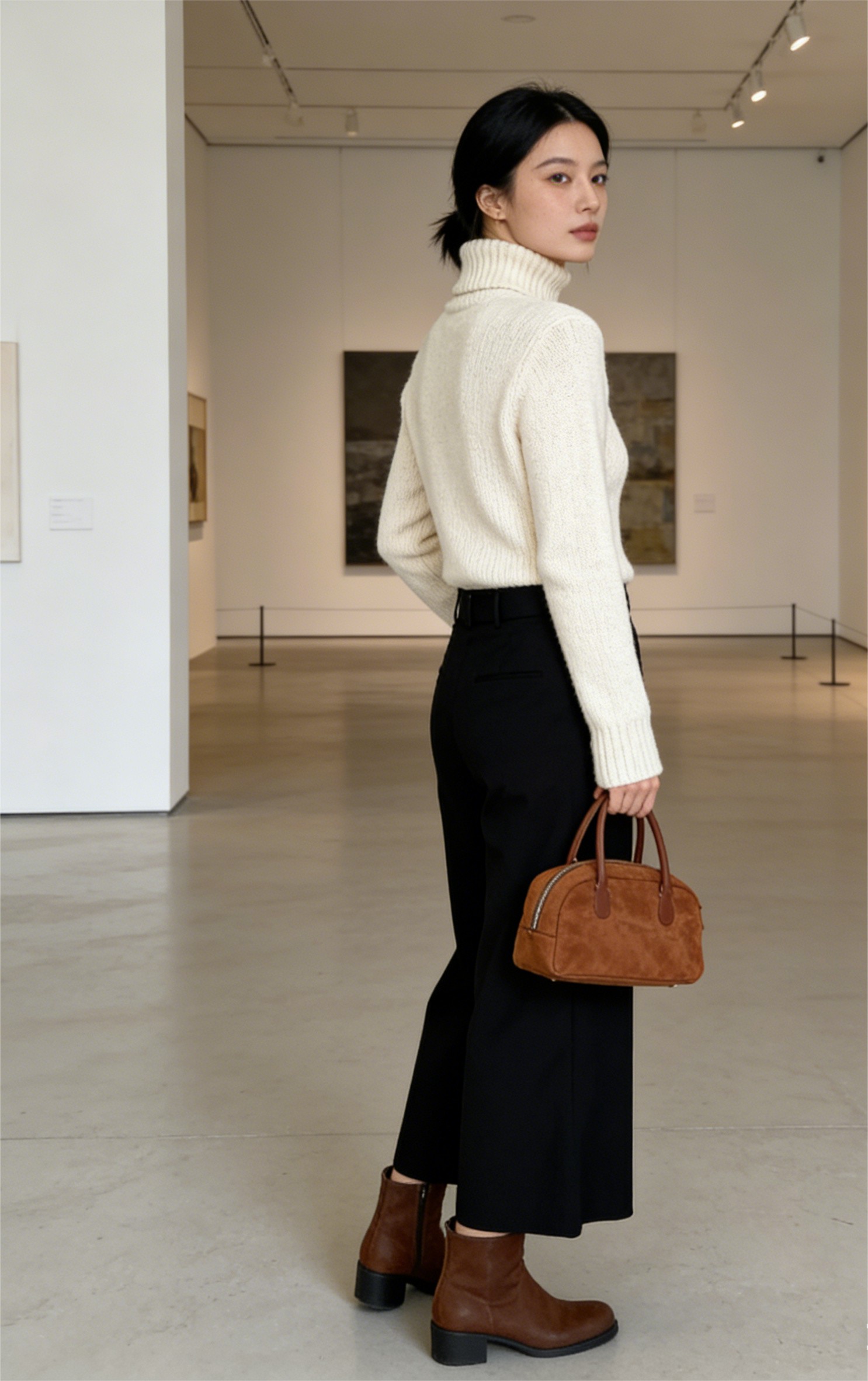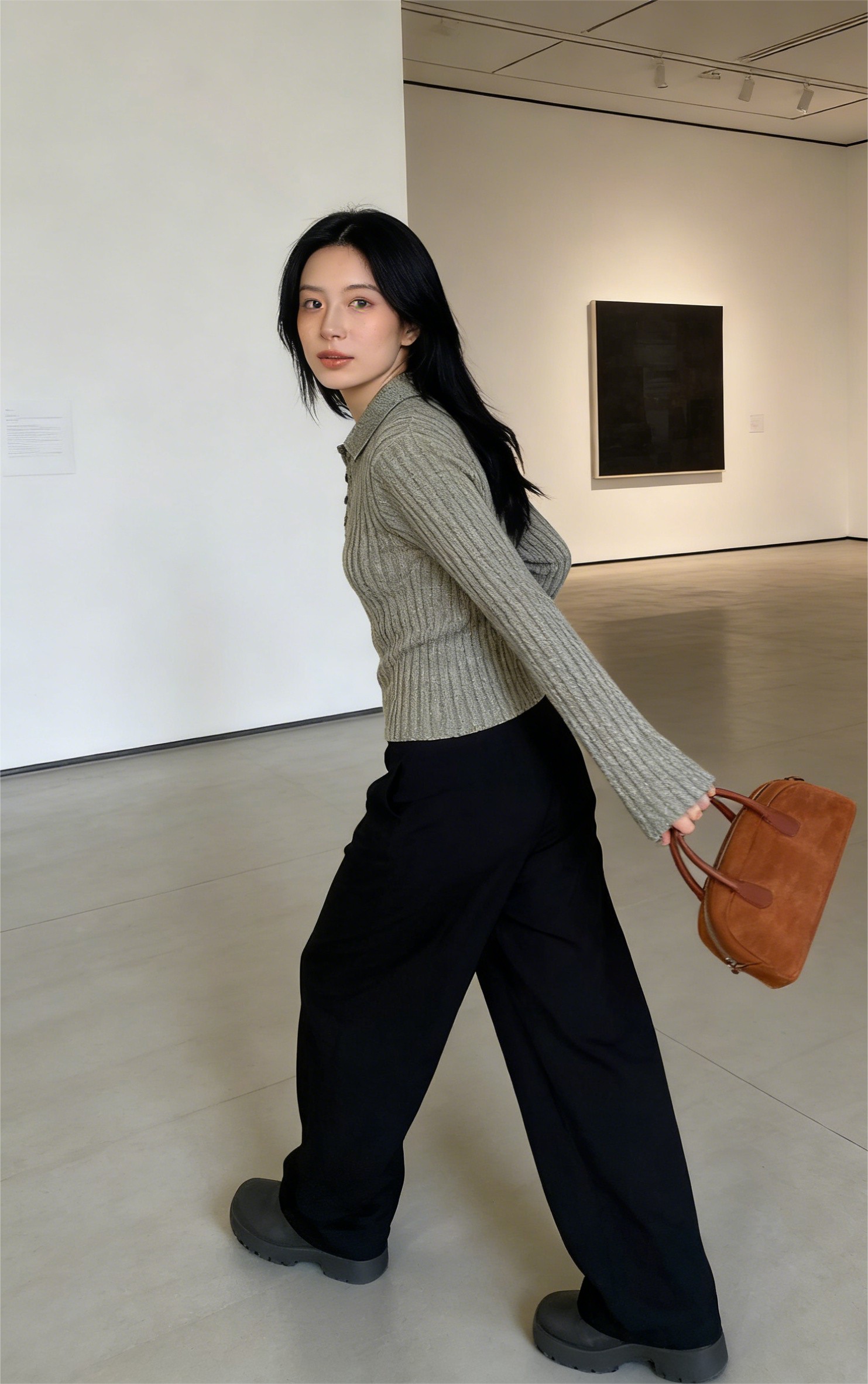 黑色或深棕靴子与裤色呼应,拉长腿部线条。相比细高跟鞋,厚底靴的稳定性更高,适合长时间站立观展,避免腿部疲劳。