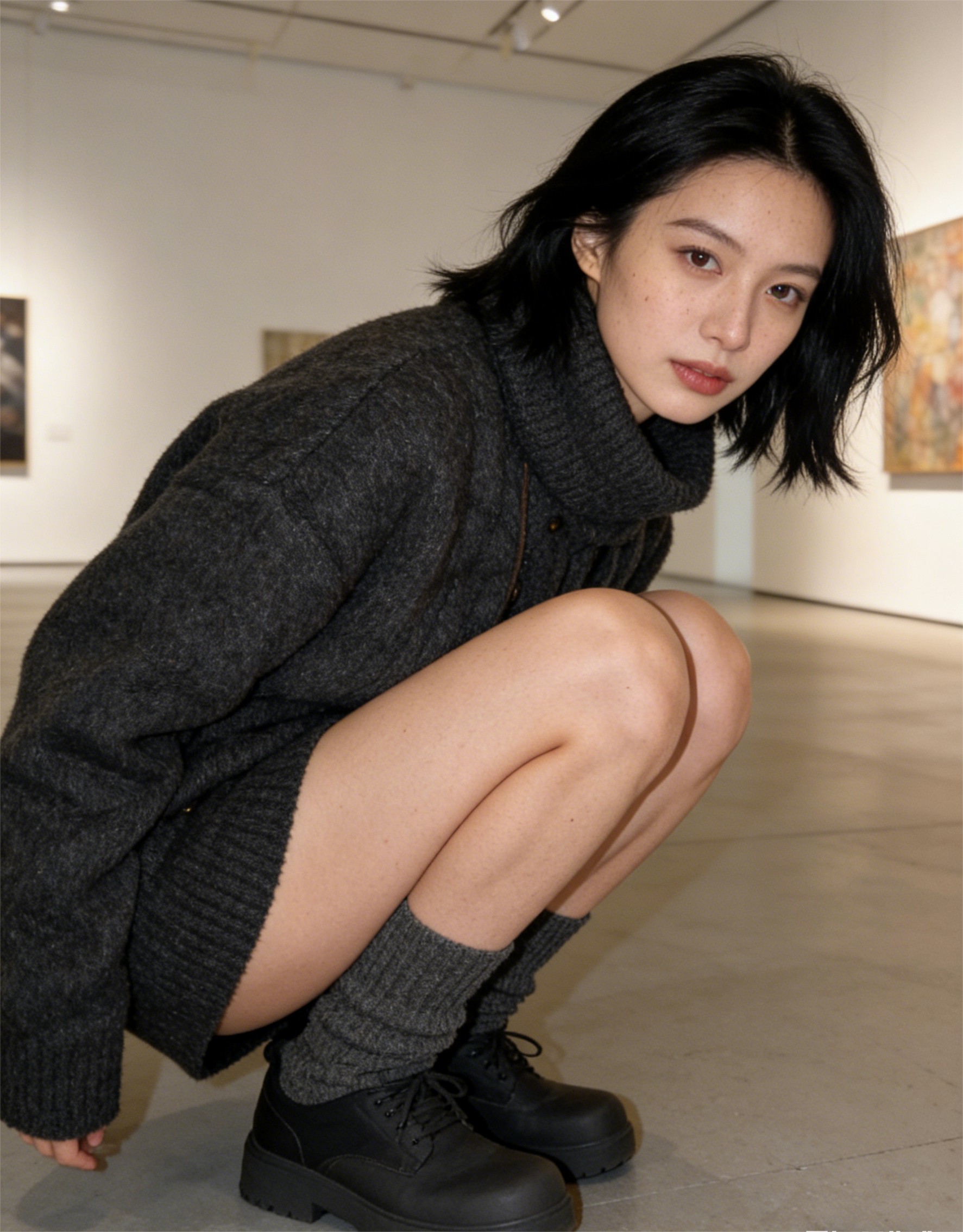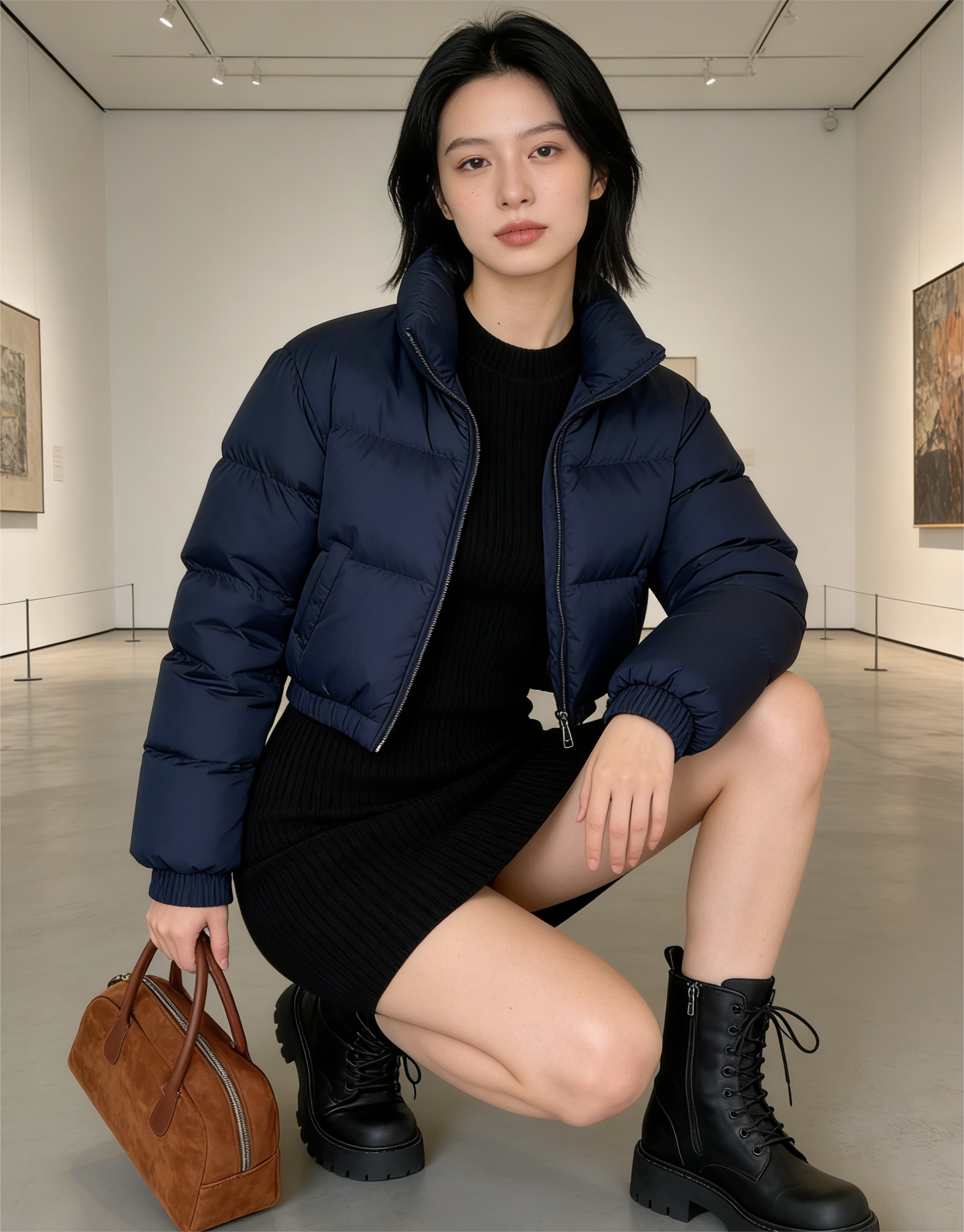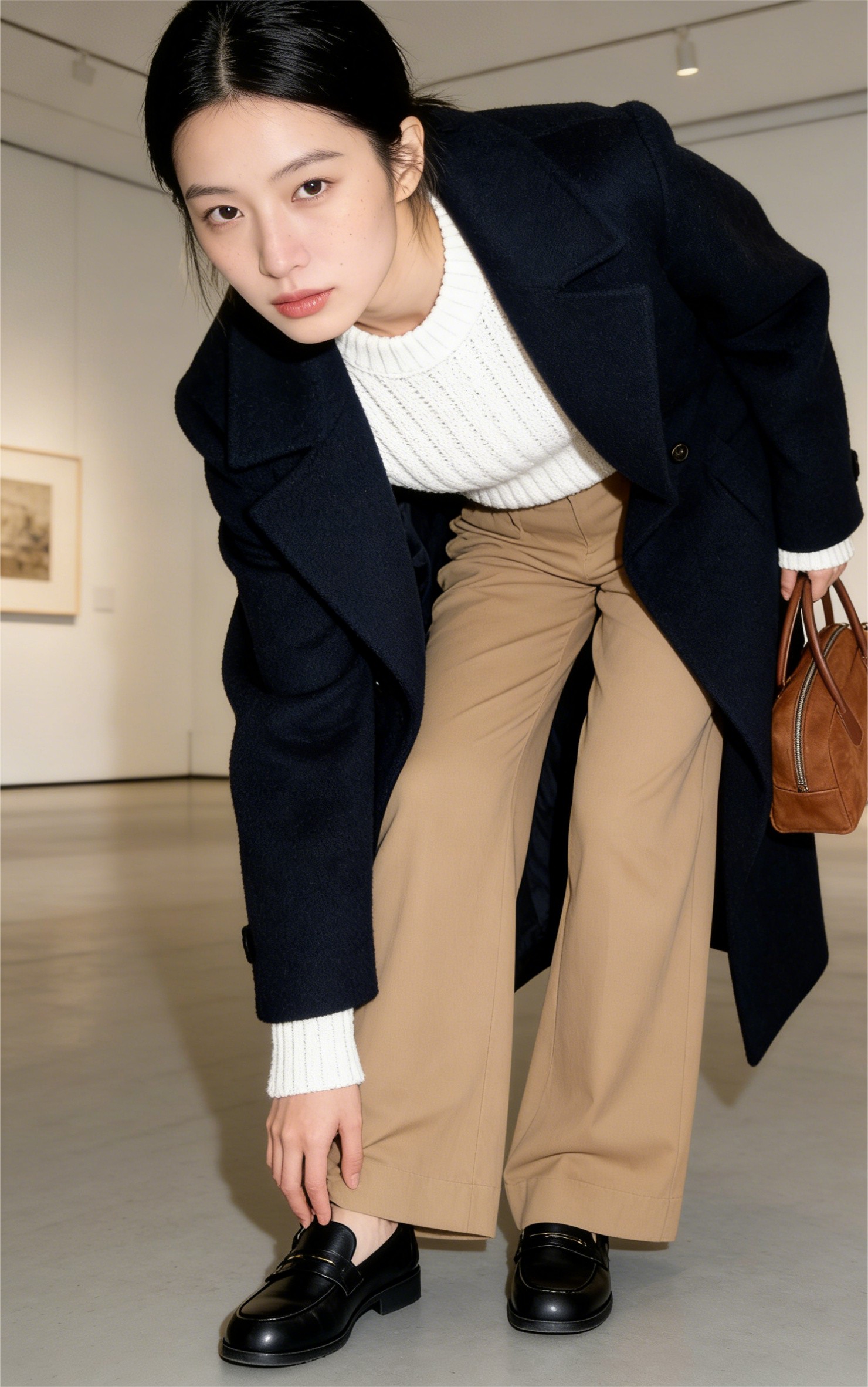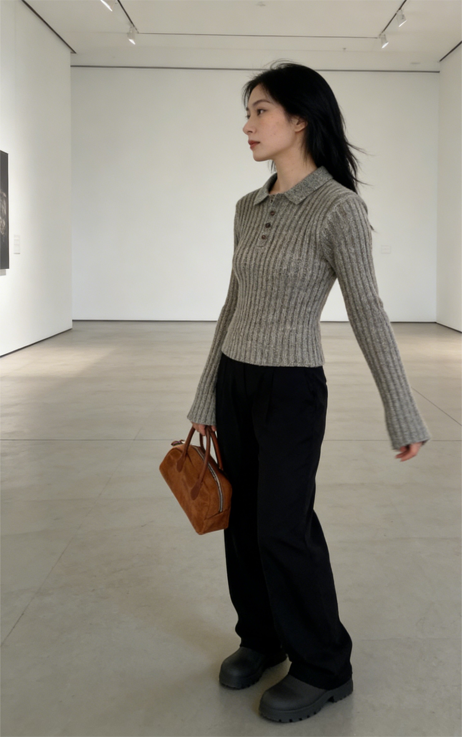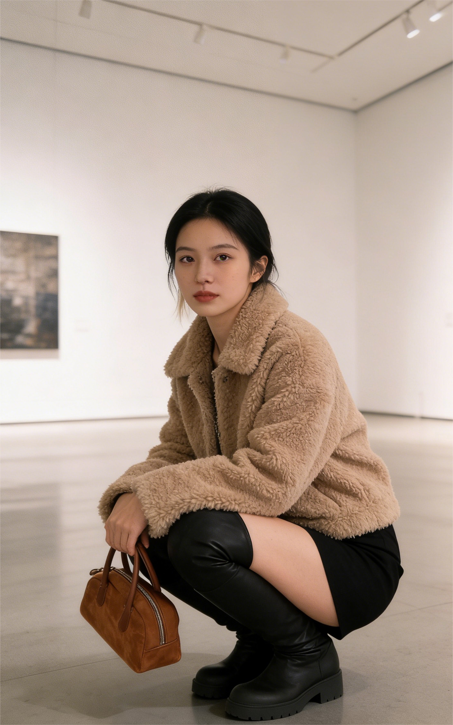 黑色或深棕靴子与裤色呼应,拉长腿部线条。相比细高跟鞋,厚底靴的稳定性更高,适合长时间站立观展,避免腿部疲劳。