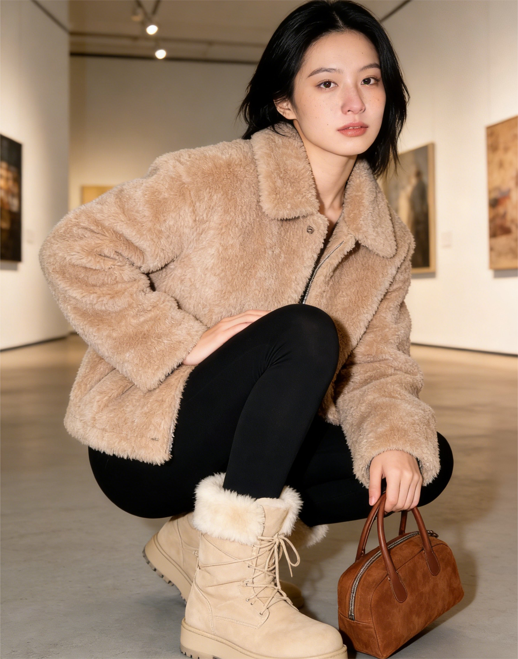 羊羔毛增添柔软质感。选择与内搭同色系的外套,能让整体造型更和谐,高级感翻倍。