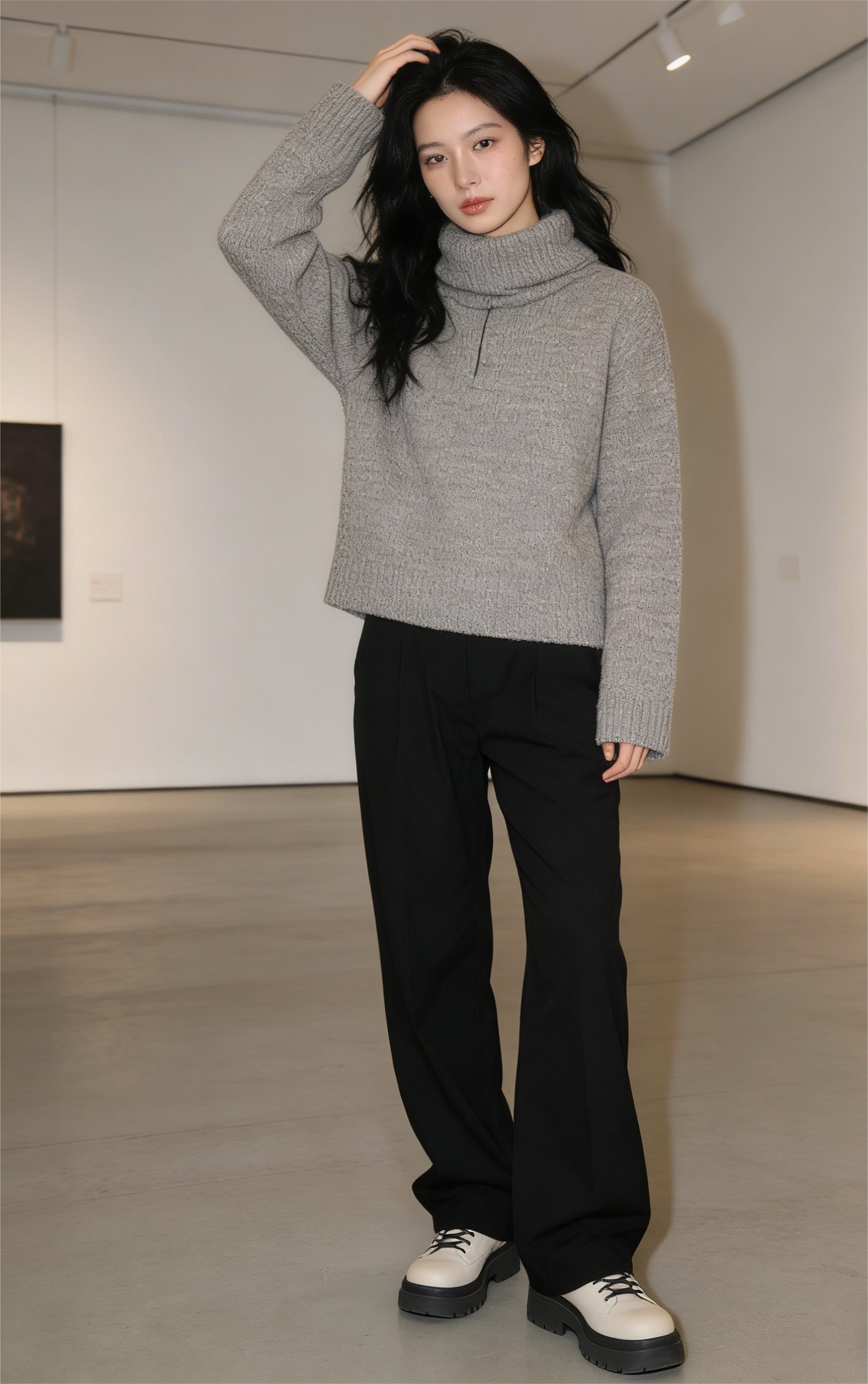 宽松灰色毛衣叠加黑色直筒裤或西装裤,是冬季最实用的搭配。毛衣选择羊毛或羊绒混纺,保暖指数更高;宽裤版型遮肉又显腿长。