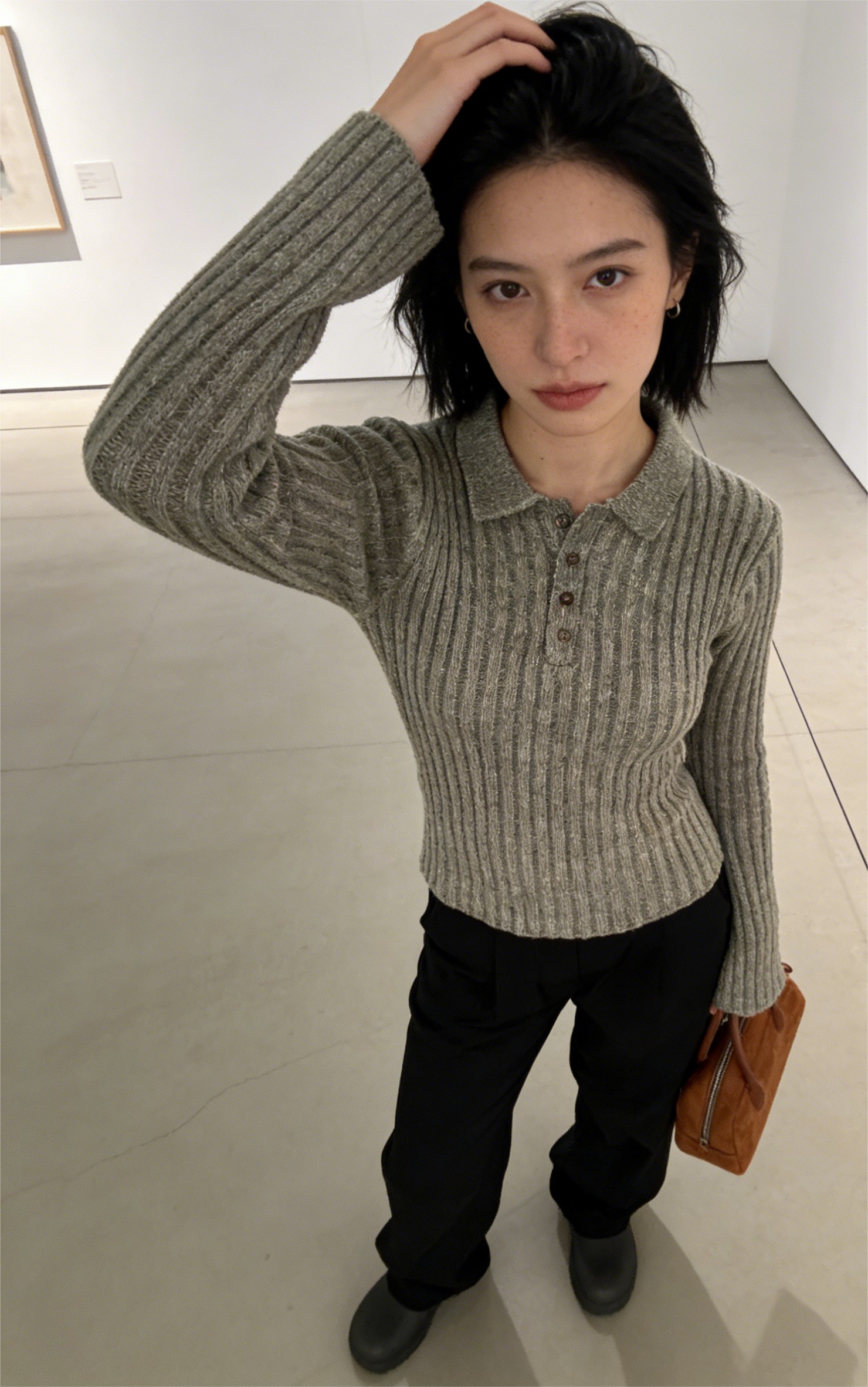 棕色与灰黑的搭配属于邻近色,温和不突兀,却悄然提升整体温度感。想要更女人味,可换成同色系唇釉,轻涂咬唇妆,瞬间增加精致度。
