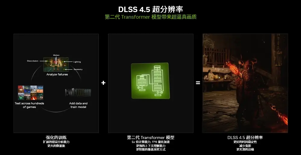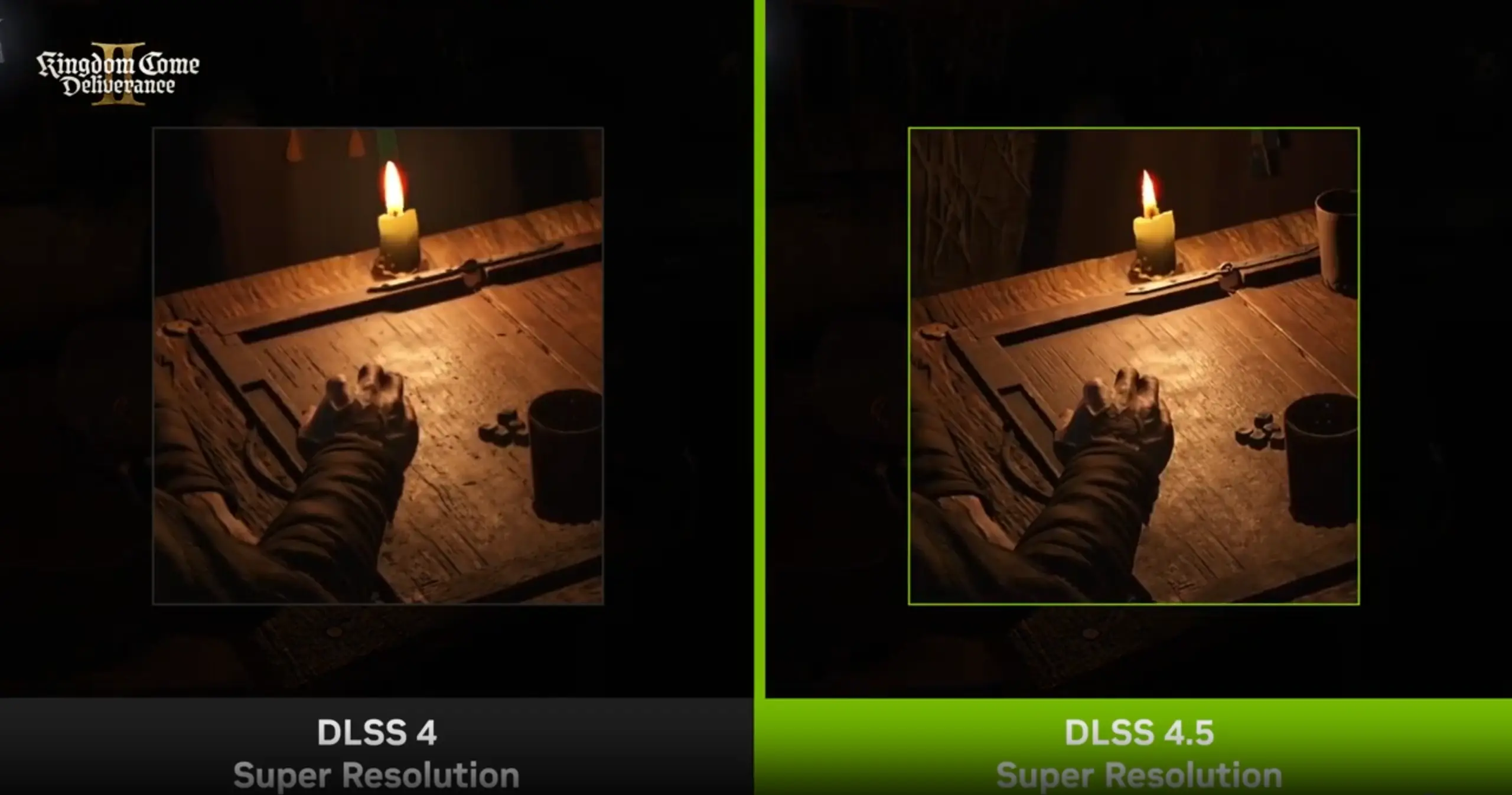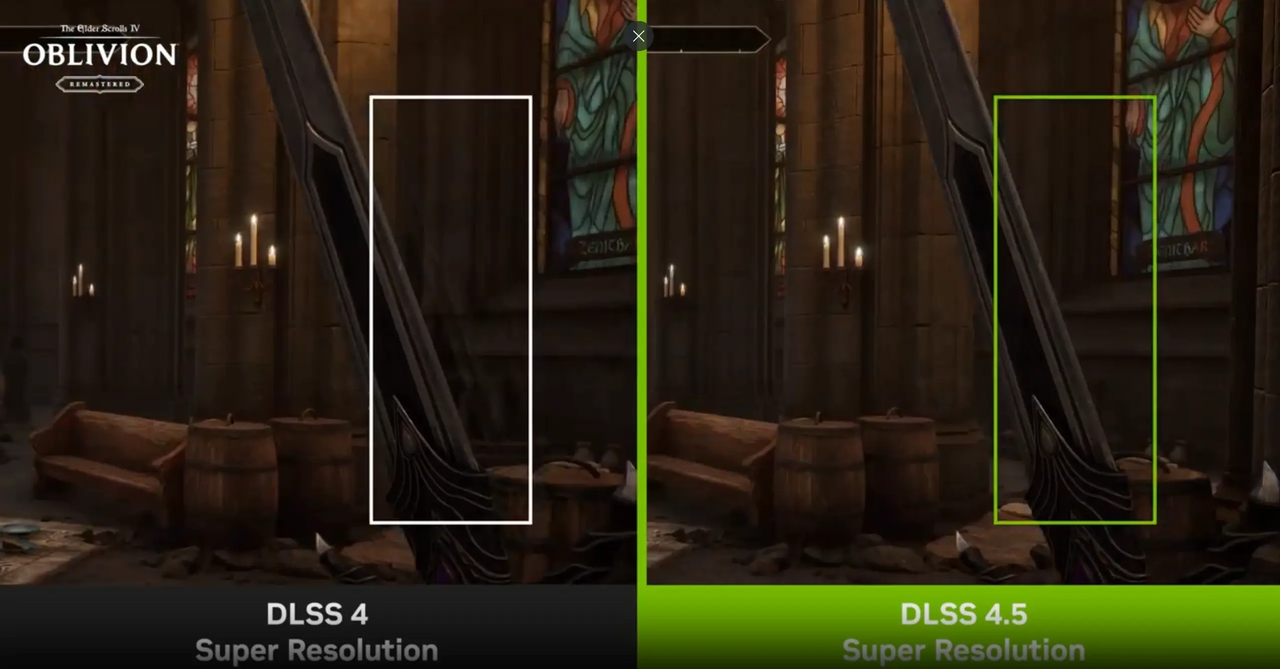 DLSS4.5超分辨率的好处不仅仅只是6倍多帧生成模式,在多个演示视频《天国:拯救2》《上古卷轴 IV:湮灭重制版》《夺宝奇兵:古老之圈》中,我们可以看到第二代Transformer AI模型相比第一代模型全面提高画质,还有更清晰的抗锯齿效果、并且大幅减少在快速移动镜头中会偶尔出现鬼影的状况。