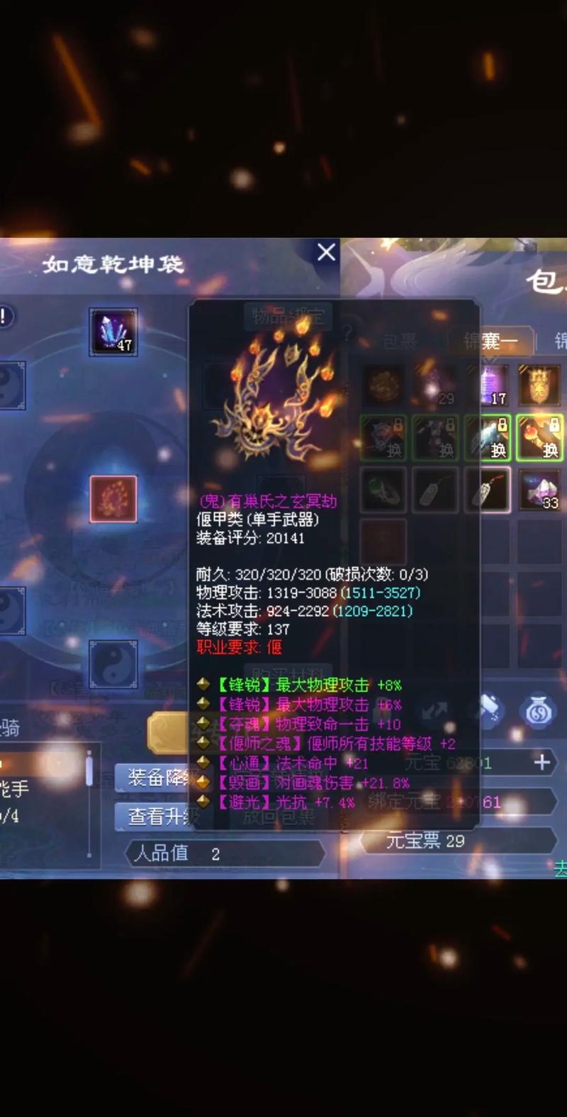 幸运装搭配:89级后,优先去NPC胡媚娘处用“琉璃盏”兑换80级幸运套装-6。不惜成本将套装属性洗炼为 “全幸运” ,并配备双幸运武器和幸运钟等法宝-6。