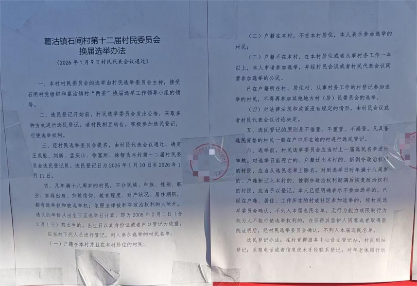 石闸村此前公布的换届选举工作方案明确,正式选举将于2026年2月1日9:00至16:00举行。按照选举相关规定,选民名单需在选举日20日前(即1月12日前)完成公示,候选人提名、资格联审等后续环节也有清晰时间规划。这一要求既是保障村民知情权的基础,也是选举合法推进的前提。但实际推进中,核心要求并未落地,截至村民集中反映问题时,选民名单仍未正式公布,合法登记选民信息及候选人员初步情况均未公开,与 2026 年新的选举法规定明显不符,引发村民对选举严肃性的质疑。
