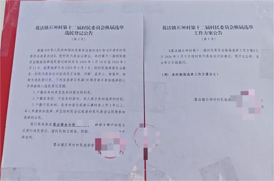 距离正式选举不足半月,选民名单仍未公示;多次咨询参选事宜,却只得到“按流程等待”的模糊回应。近日,天津市津南区葛沽镇石闸村第十二届村民委员会换届选举陷入争议。这场自2026年1月3日启动、定于2月1日收官的基层民主实践,本应是村民行使民主权利的重要契机,却因多项关键流程不透明、时间节点落实不到位,让村民疑虑丛生。