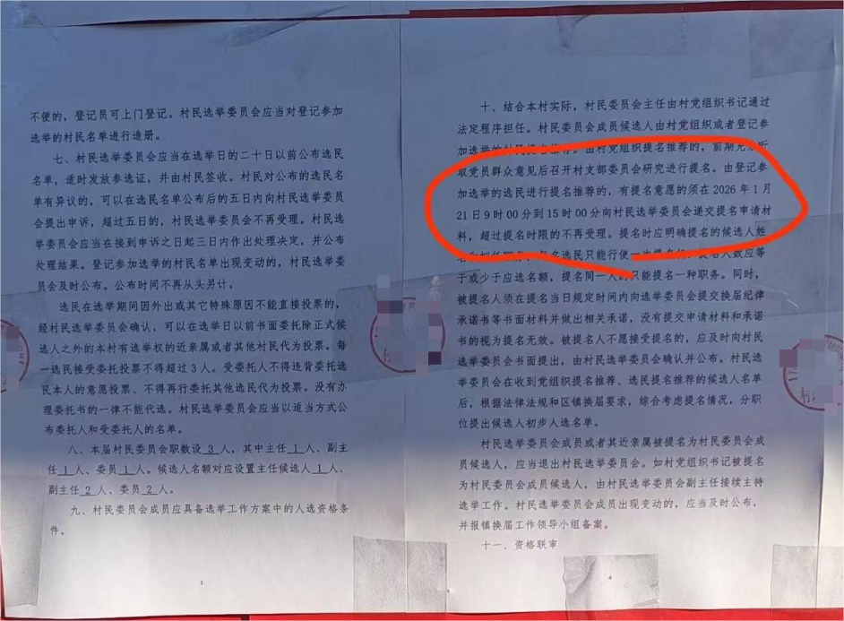 多名符合条件的村民早早表达参选意愿,却始终未能顺利登记。咨询时,工作人员仅以“需按流程等待公示”笼统回应,未明确报名时间、所需材料及核心流程。据悉,本届选举实行提名制,需由本村合格选民提名成为候选人,但因选民名单迟迟未公布,村民无法确认提名资格人员范围,参选通道实质不畅。更让村民困惑的是,按合理程序应先公布选举流程再成立选委会,但实际选委会已组建完成,具体流程仍未公开,存在明显流程倒置嫌疑。