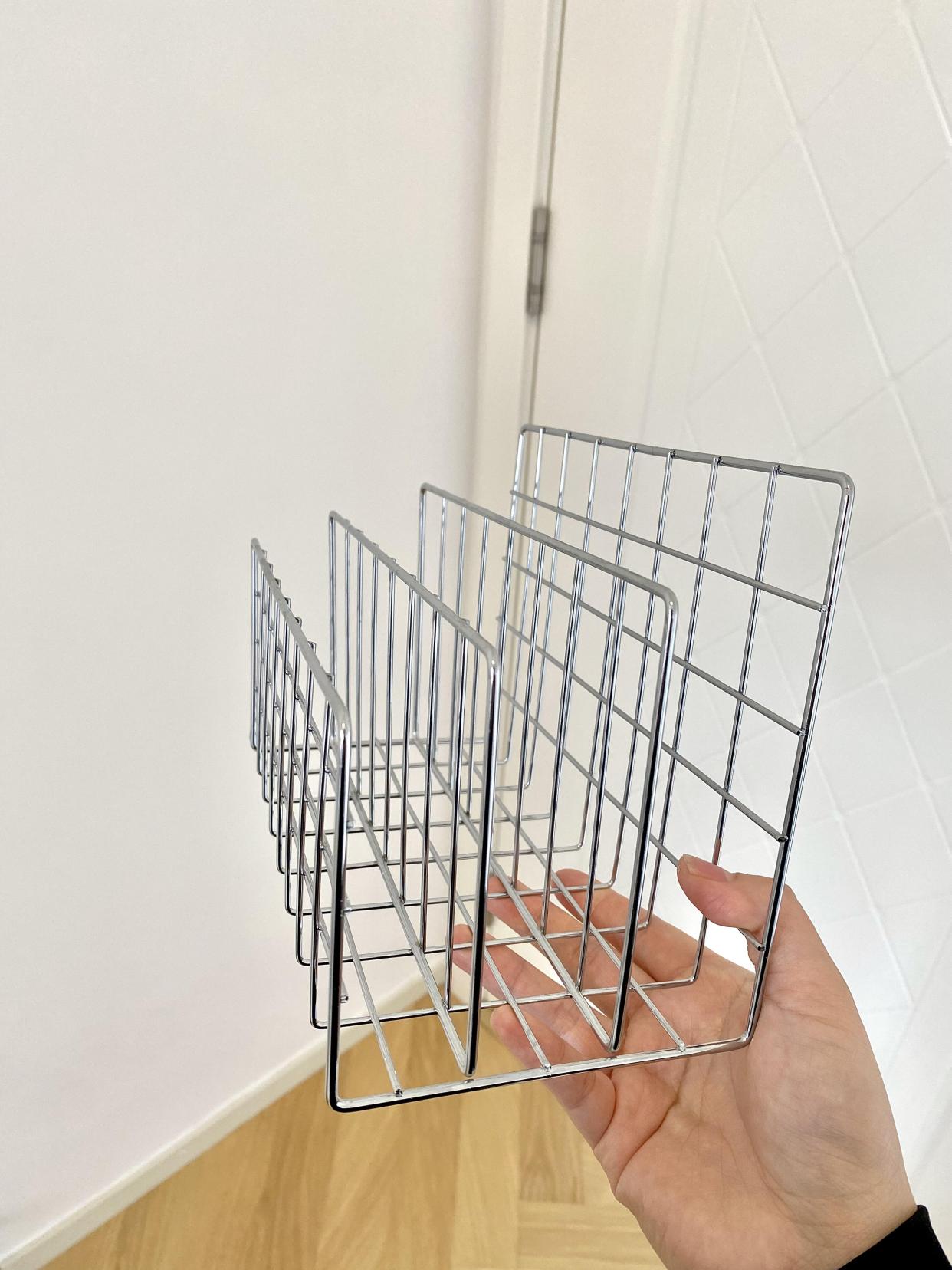 邪修之后发现用不锈钢书立来收纳砧板,反而比专用的砧板收纳架更好用,而且适合多种尺寸的砧板,往柜里一插,多块砧板立得整整齐齐,通风防霉,拿取方便还不占地方。