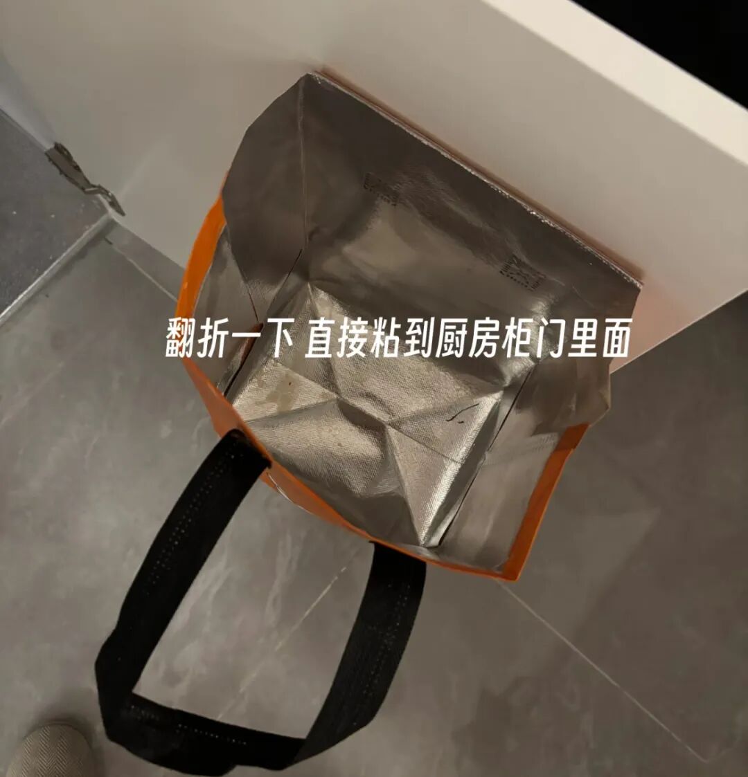 其实有个收纳小思路,点奶茶剩下的外卖袋不要丢,把袋子翻折后,用双面胶贴在厨房柜门内侧。这样一来,各种塑料袋都能往里塞了。