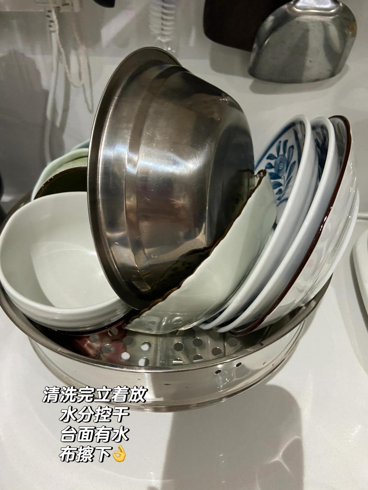 蒸屉均匀分布的小孔,沥水效果妥妥的,还能一边沥水一边收纳。反正每天都要用的碗碟,与其费劲收进柜子,不如干脆就不收了,让它们沥干后直接放在蒸屉里,要用的时候随手就能取到。