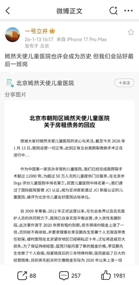 在这个视频里没有公关话术、也没有哭天抢地卖惨,就很平静地讲述一件事:嫣然天使医院撑不下去了,面临关闭。他承认了确实欠房东租金。