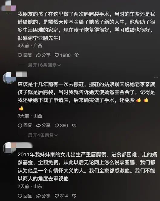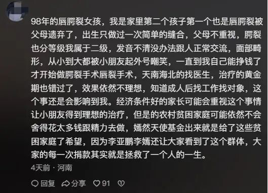 看看李亚鹏视频底下的留言,就知道唇腭裂的家长多感激。