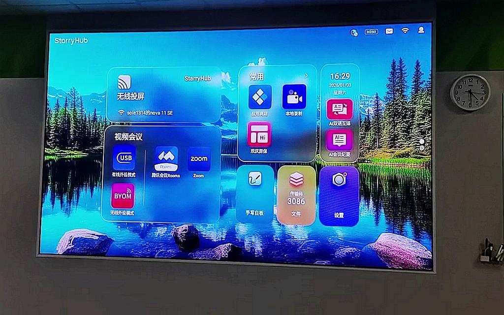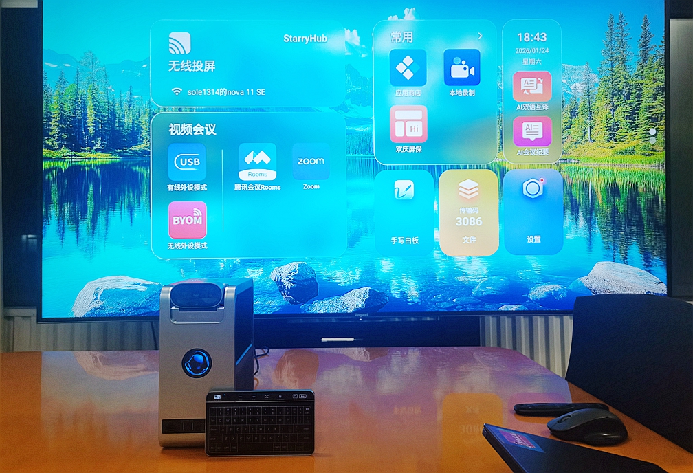 最让我省心的是它的便捷性,拆开包装,接上电源,再用HDMI线连到旧投影仪上,开机就能用,真正做到即插即享,完全不用复杂组装和调试。以前每次开会前,我都要提前十几分钟到会议室准备,现在只要提前2分钟打开它,就能快速进入会议状态;就算是刚入职的新同事,也能轻松上手,省去了繁琐的开会准备动作,让会议效率直接提升一倍。