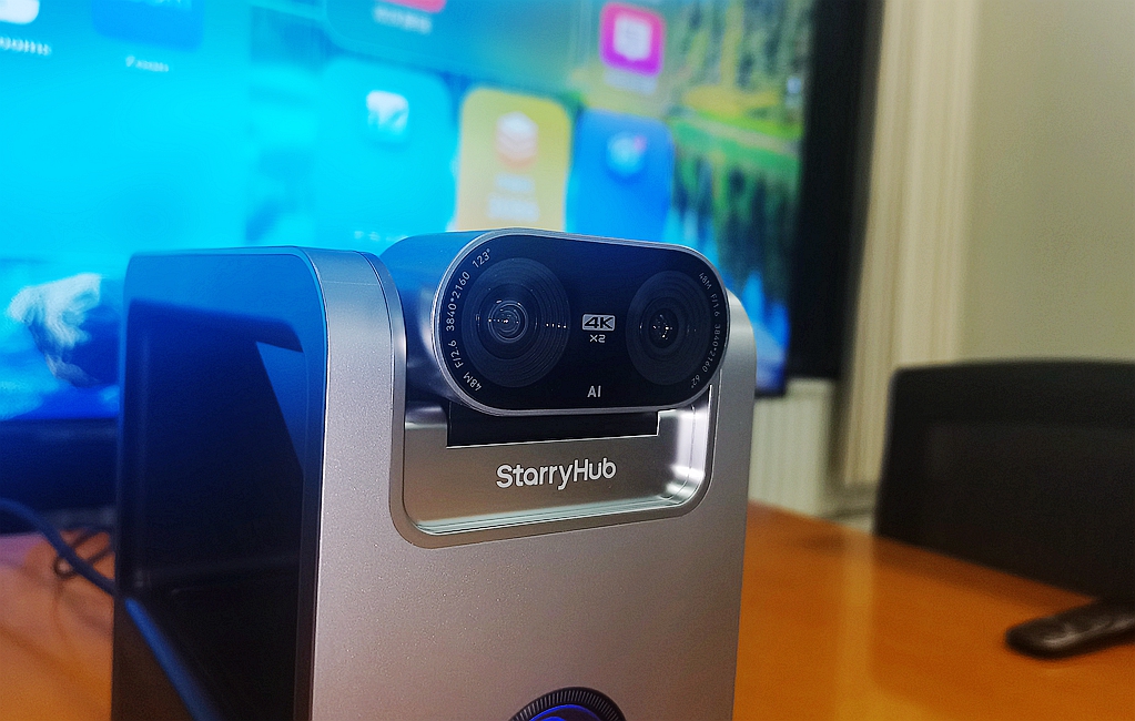 作为一款会议设备,音视频表现才是核心,这款成者StarryHub会议星AI会议机器人的实际体验更是惊艳。它搭载了双4K AI摄像头,同时也是4800万像素的广角+长焦组合,其中一个123°广角镜头负责拍摄会议室全貌,就算是十几个人围坐开会,也能轻松全覆盖;另一个62°长焦镜头,能精准取景,比如有人发言时,会自动聚焦到发言人身前,远程参会的同事也能清晰看到细节,画面不畸变、不卡顿,跟面对面开会几乎没区别。