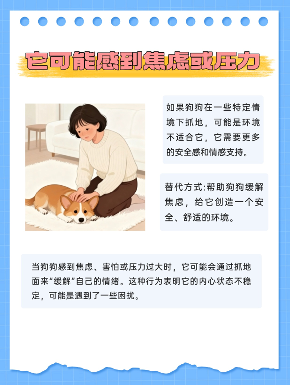 就像人紧张时会搓手一样,狗狗在感到压力或焦虑时,也会通过抓地板来舒缓情绪。这种自我安抚的行为常见于雷雨天气、主人离家或遇到陌生人的情况下。