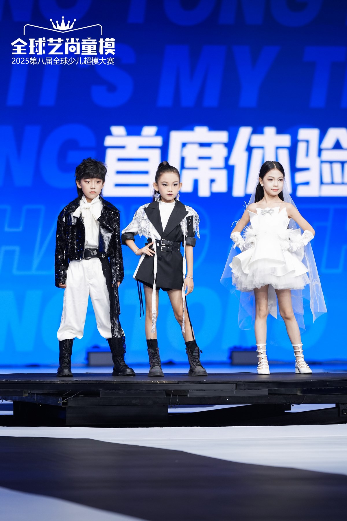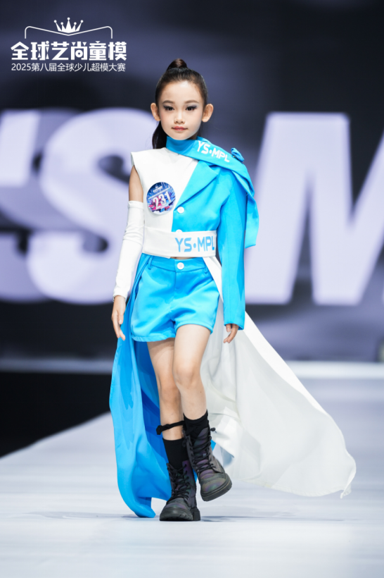 聚光灯如追光使者般紧紧跟随。小超模杨思恩身着带有银流苏装饰的黑色长外套,搭配黑短裤与黑靴,自信迈步。每走一步,流苏便随之轻摆,似在舞台上跳着灵动的时尚之舞,将酷帅与潮流感展现得淋漓尽致,为这场大赛注入满是活力的时尚气息