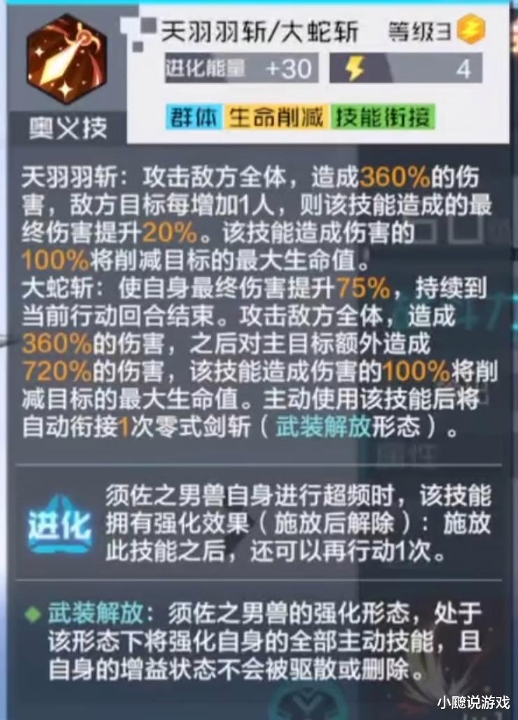 通常技与奥义技的连招确实流畅:在“武装解放”形态下,“零式剑斩” 接 “断罪之刃”、“大蛇斩” 接 “零式剑斩” 的联动,能覆盖单攻、群攻场景,但伤害数值属于 “同定位正常水平”—— 比如 “大蛇斩” 全体 360% 伤害 + 主目标 720% 补刀,对比同类型群攻数码兽并无明显优势,更多是靠 “连招衔接” 提升输出效率。