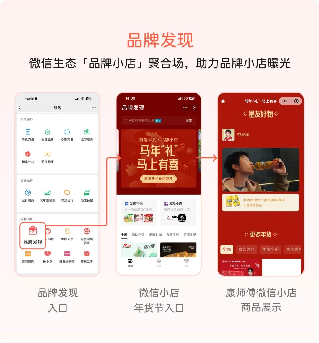另外,目前微信的“服务”入口中还出现了“品牌发现”这个聚合页。春节期间,这里也为微信小店策划了年货节会场,很多品牌除了在朋友圈等场景投放广告外,也会在品牌发现的聚合页获得展示,这相当于为品牌提供了又一个持续经营阵地。