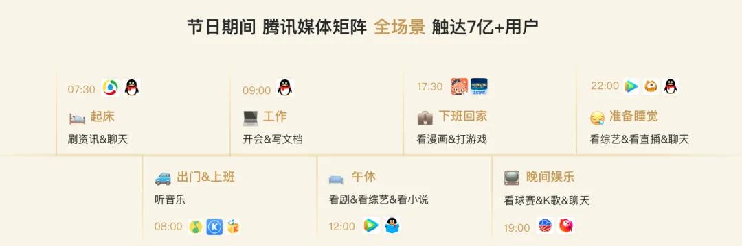 这得益于腾讯广告囊括了腾讯视频、腾讯新闻、QQ音乐等腾讯系各类平台渠道,共同构成一个覆盖面极广的媒体矩阵。据官方数据今年春节期间,腾讯媒体矩阵全场景可以触达7亿+用户。