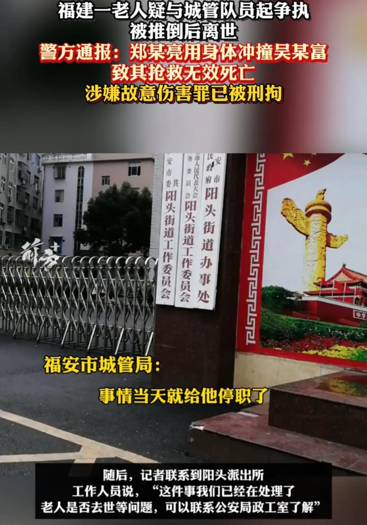 一段网传视频,把这个原本只是街头小规模冲突的事件推上了风口浪尖。画面中,老人正慢慢靠近一位身穿城管制服的男子,而对方似乎有些情绪,迎面而上,动作十分粗暴地将老人推倒。摔倒后的老人久久未起,几天后,警方通报:该名老人因伤抢救无效死亡,涉事人员郑某亮已被刑拘,身份为临时工。
