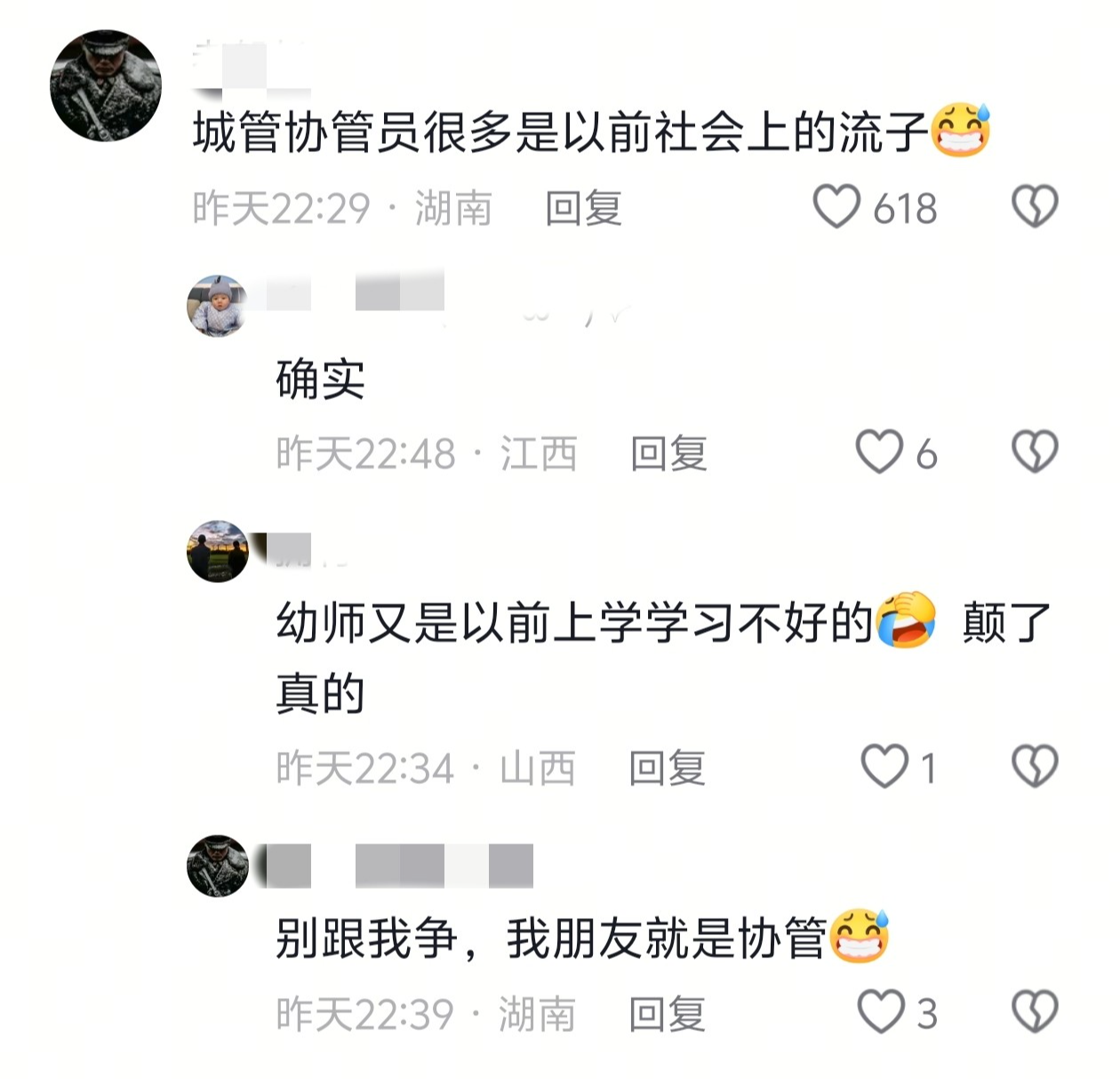 一位接近基层城市管理部门的业内人士私下透露,部分临聘人员月薪仅3000-4000元,日常无险无补、站街时间长、压力又大,一旦在街头面对激烈言语冲突,极易冲动。