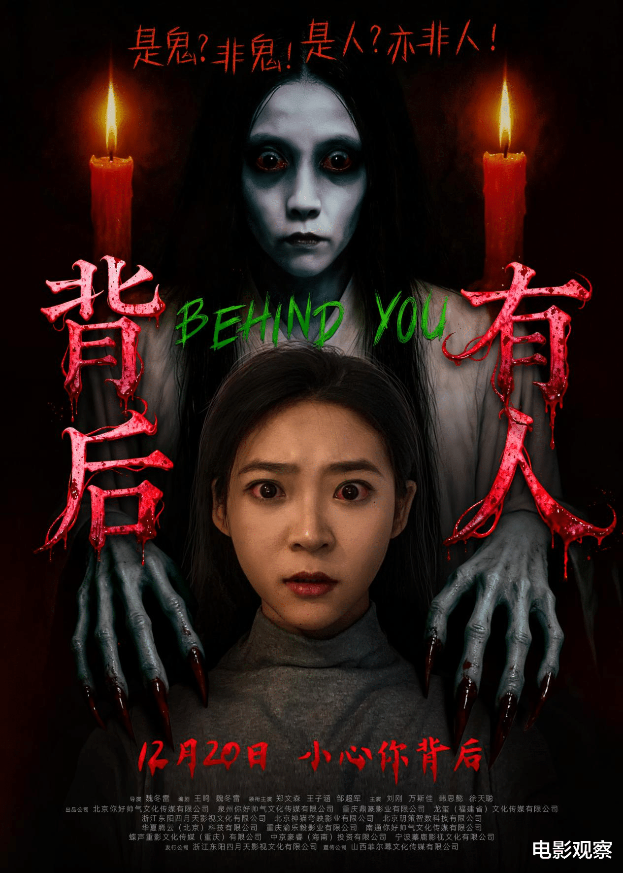 《背后有人》由北京你好帅气文化传媒有限公司、泉州你好帅气文化传媒有限公司、 重庆渝乐毅影业有限公司、龙玺(福建省)文化传媒有限公司等出品,山西菲尔幕文化传媒有限公司宣传,浙江东阳四月天影视文化有限公司发行。这部以“全感官沉浸”打破类型片边界的作品,凭借独树一帜的恐怖表达与电影级质感,成为社交平台“必看惊悚片”榜单TOP1,影片将于12月20日登陆全国院线,为渴望极致刺激的观众献上年度视觉暴击,唤醒集体恐惧!
