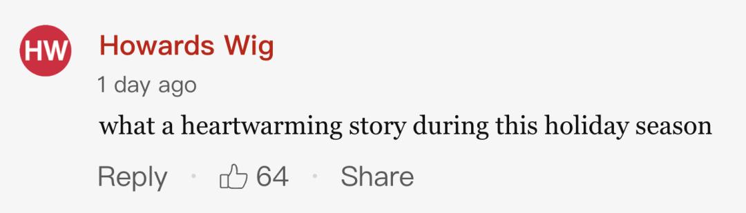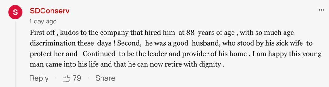 “首先,雇佣88岁艾德的公司值得点赞,尤其是现在年龄歧视那么严重。第二,他是个好丈夫,在妻子生病时保护她,之后也一直为了养家努力。真高兴塞缪尔能帮他有尊严地退休。”