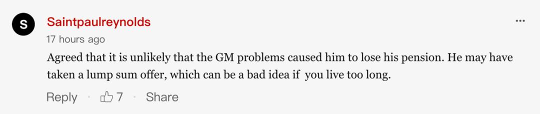 “感觉不是通用破产导致他没退休金的,可能是一次性买断后花完了吧,要是人活得长这可不是个好主意。”