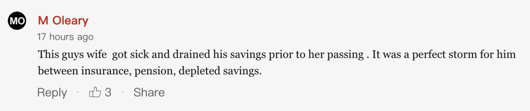 “他的老婆生病,去世前花光了存款。他处于一场‘完美风暴’里面:保险、退休金、枯竭的存款。”