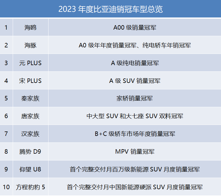 显而易见,比亚迪主动出击的勇气来源于此,而比亚迪主动出击的自信,我想应该来自于“全科状元比亚迪”的标签。2023年度,比亚迪旗下数款明星车型,均夺得各细分市场销量冠军,其中不乏主流家用车市场的元PLUS、宋PLUS、秦家族等车型。