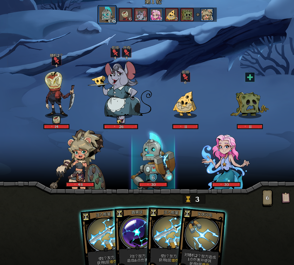 进入游戏,我们需要操作三名探险伙伴进行战斗,获取不同的卡牌,让自己的属性更进一步,同时探索潜藏在黑暗森林之中的秘密,游戏内的角色分工明确,有擅长保护队友的,有擅长治愈队友的,当然也有强力攻击类型的,我们需要按照每回合的体力进行分配击败对手即可获得每次战斗的胜利。