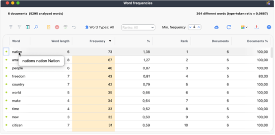 窗口最上方会给出分析范围与规模的概要:已分析的文档数量、已解析的总词数、不同词汇的总数,以及类符-形符比(type-token ratio,即独特词汇数 ÷ 总词数;这是衡量词汇多样性的粗略指标,且对文本长度敏感)。更多细节可查阅MAXQDA 手册。