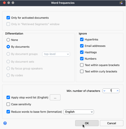 当你选择 MAXDictio › 词频 › 词频(仅统计Go词表中的词)时,MAXQDA会只统计当前激活Go词表里列出的词汇。其思路与停用词表相反:不是排除不需要的词,而是仅保留你关心的词。
