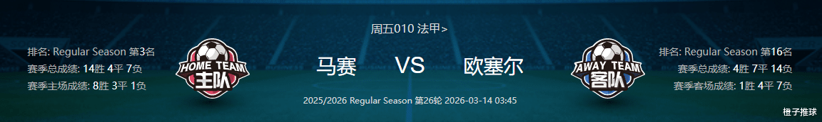 看法:这场比赛最大变数其实在历史交锋,虽然马赛账面实力强太多,但双方近10次交手,马赛竟然只胜了2场败足7场 ,再加上欧塞尔现在被逼到降级边缘,肯定得拼命防守甚至玩命肉搏 ,不过考虑到欧塞尔不仅进攻差,而且客场还缺兵少将主力前锋西纳约科禁赛,想在马赛主场爆冷的难度实在太大,综合来看,马赛现在状态回暖刚拿下两连胜,又是主场作战,没理由放过抢分巩固前三的机会,个人认为本轮马赛主场大胜可期。