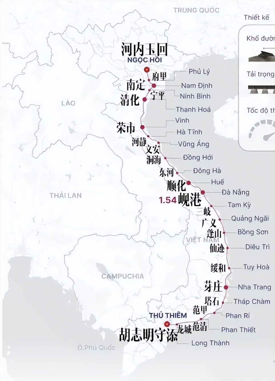 说起来,越南的南北高铁梦做了快 20 年了。早在 2001 年就有了构想,2006 年正式定名,规划全长 1541 公里,从河内连到胡志明市,途经 20 个省市,设计时速 350 公里,建成后能把原来 30 多个小时的车程缩短到 5 小时,听着确实诱人。