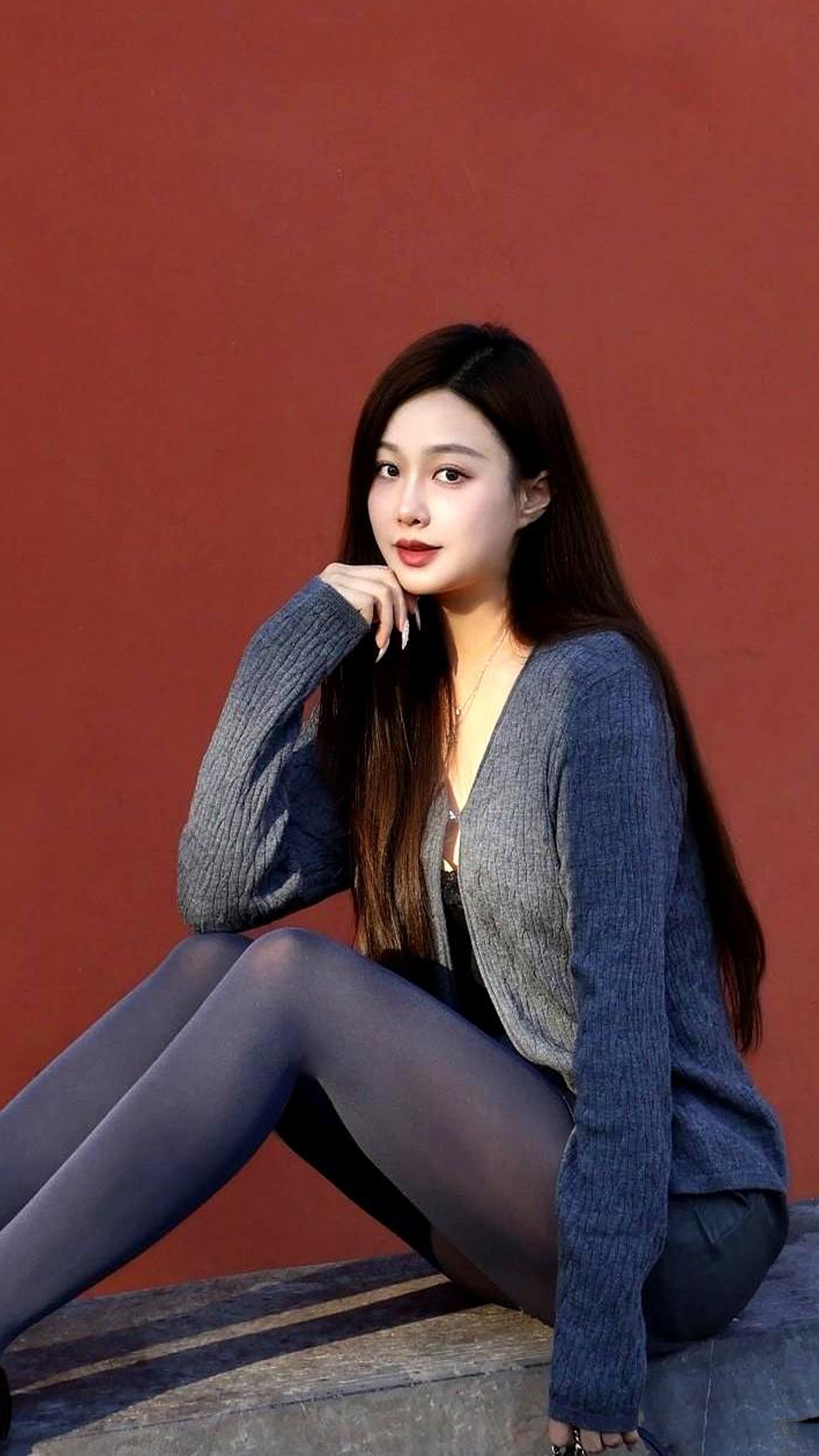浅蓝灰色针织开衫内搭黑色上衣,配合同色系短裙与深蓝丝袜,脚踩带银色搭扣的深色高跟鞋。整体色调冷静和谐,菱格纹链条包与精致妆容点缀细节,在传统红墙与绿竹的背景衬托下,呈现出一种精致、优雅且带有一丝复古韵味的都市时尚风格