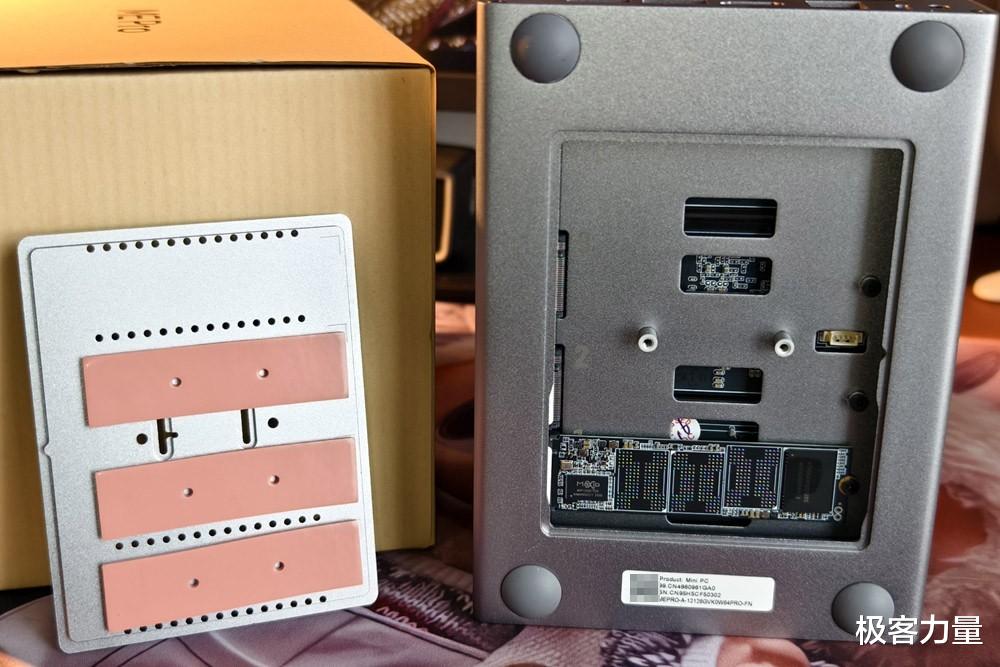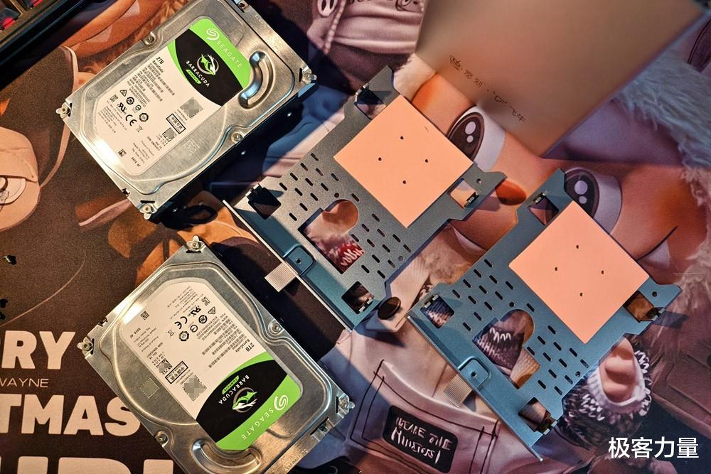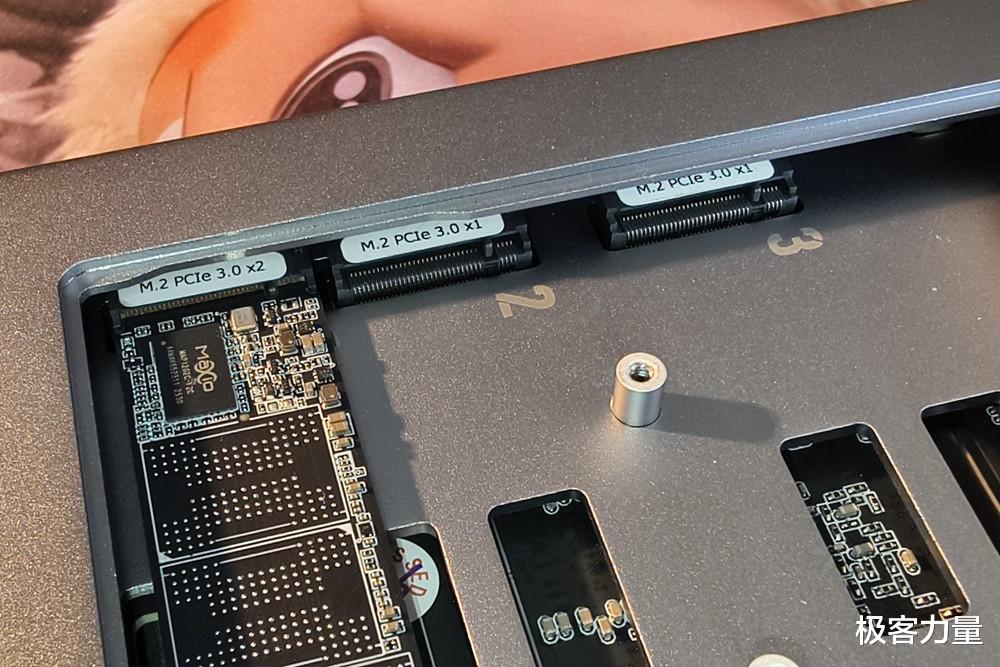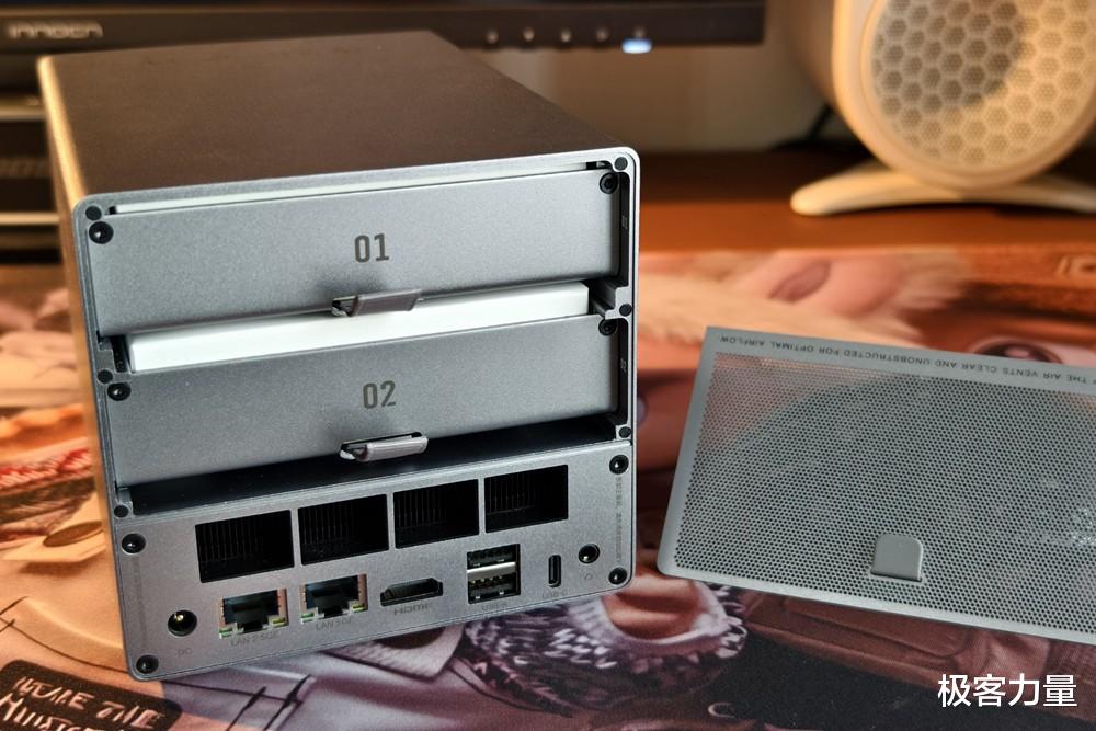 打开机身更是惊喜满满,磁吸盖板一掀即开,内部的抽屉式硬盘架设计巧妙,每个硬盘架都配有减震硅胶垫和导热贴,既能减少硬盘震动噪音,又能辅助散热。更厉害的是,它在如此小的机身里塞下了5个盘位 —— 两个支持2.5/3.5英寸SATA硬盘的机械硬盘舱,再加上底部隐藏的3个M.2 2280插槽(1个PCIe 3.0×2+2个PCIe 3.0×1),单盘最大支持4TB,总容量最高可达72TB,不管是存满4K蓝光原盘,还是备份海量工作文件、家庭照片,都绰绰有余。