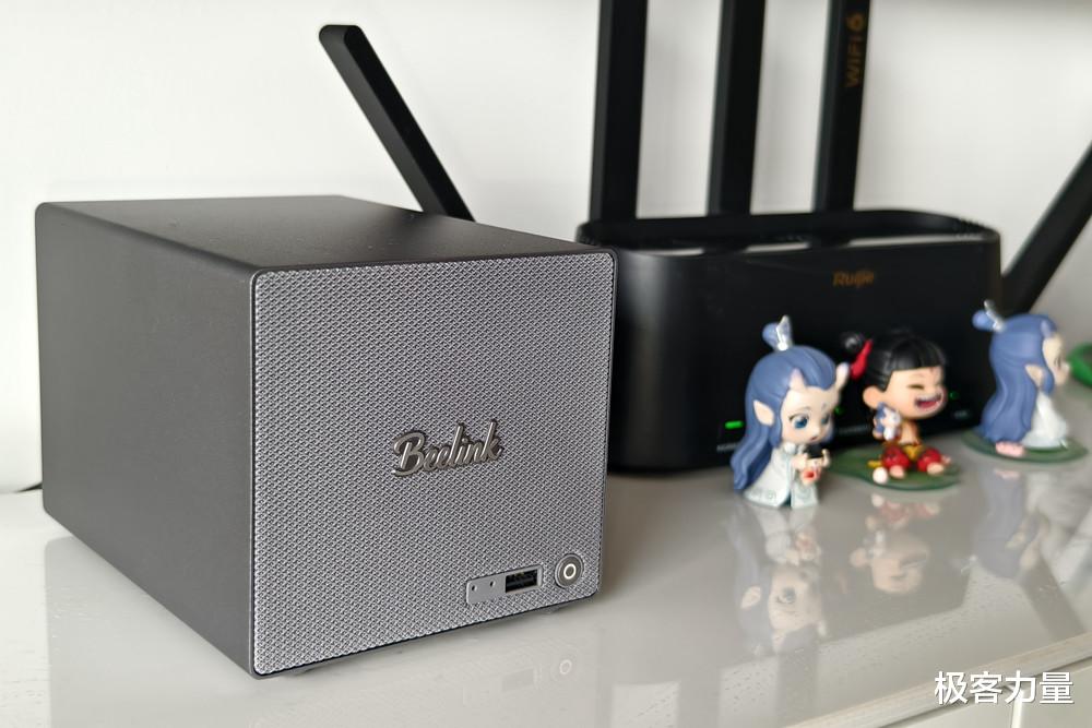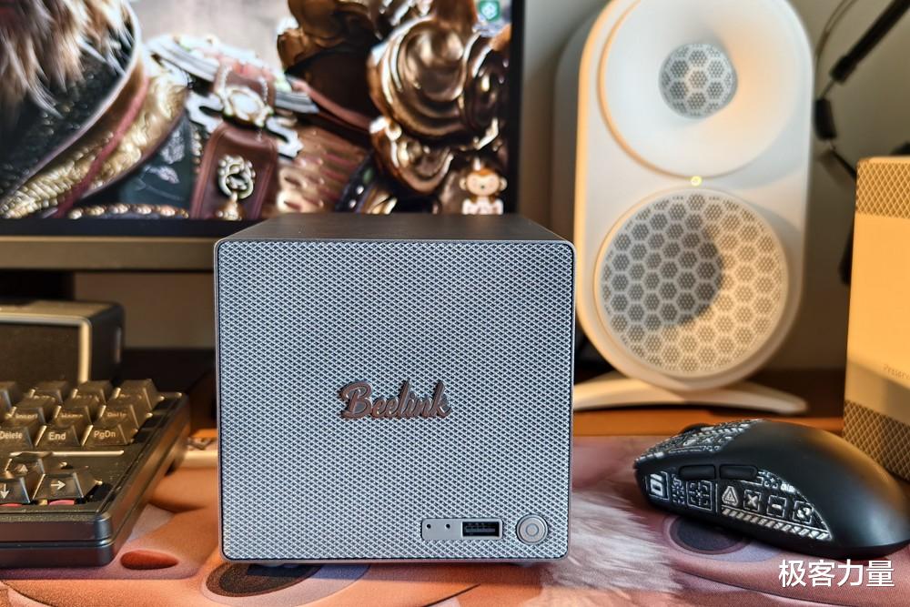 第一次见到零刻ME Pro,很难把它和NAS联系起来——166mm×121mm×112mm的机身,比主流双盘位NAS小了近一半,单手就能轻松握住。全金属一体成型外壳搭配细密喷砂工艺,摸起来质感十足,正面的灰色编织网布+Beelink Logo,妥妥的复古音响既视感,放在书房、客厅甚至卧室都毫不违和,彻底打破了传统NAS与桌面风格格格不入的尴尬。