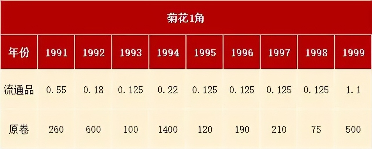 其中2000年菊花1角硬币未正式发行流通,装帧在2000年度《中国硬币》套装中,作为收藏品出售。