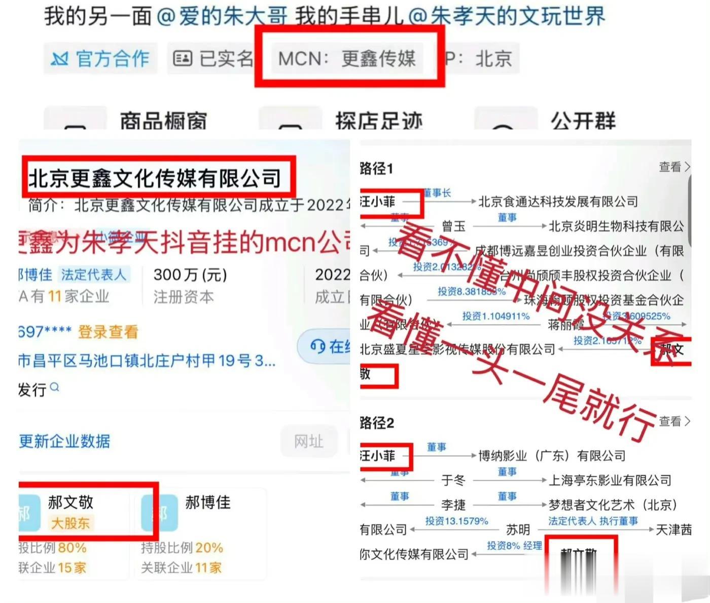朱孝天主页显示其所属MCN机构为更鑫传媒,由郝文敬持股80%控股。这个郝文敬与汪小菲有多家企业股份中有关联。