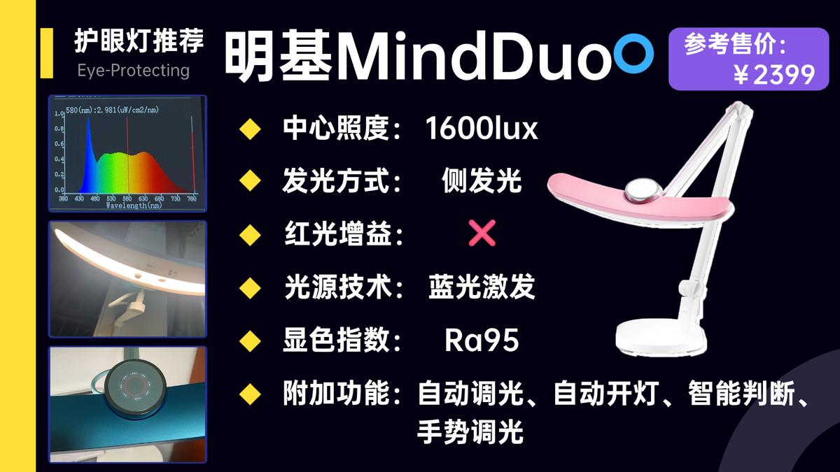护眼灯最好的品牌排行:第四名是明基MindDuo,它的优势体现在功能方面,支持亮度侦测自动调光,可将光线稳定在舒适范围,不用手动反复调节。同时色温方面它拥有 3300K-5300K 可调范围,能满足孩子读写、绘画等多样化用光需求。不过也有需要注意的地方,它采用的是传统蓝光激发全光谱技术,这类技术的台灯,有害短波蓝光通常偏高,从光谱图能看到,其有害蓝光峰值约 1.0,实话说这个表现在千元级台灯里算不上出色。