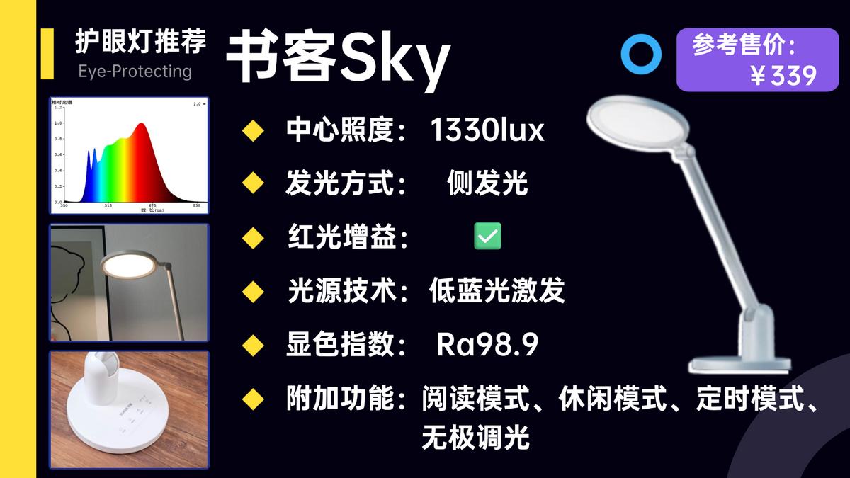 为了解决市面上百元护眼台灯护眼效果不足的问题,书客sky坚守了一直以来「明·护·广·养 」四重守护理念,通过十年以上的护眼研发经验,突破了传统照明技术的局限,专研出SunSilk™护眼芯片和5域环控光学系统的创新性组合,通过高密度导光板与多层扩散膜组合,结合类自然光谱智能驱动,形成多维度光线调节机制。结合DT多维漫射2.0技术,光线在发出的过程中经过精密漫射与动态校正,实现全方位柔和覆盖。它家创新设计了RRT2.0硬核养眼黑技术,相比传统的护眼台灯,能够更加精准的抑制住400-450nm有害高能蓝光,将红光效果增强至极限,每天“三分钟”即可为眼部输送养分,也正因如此,书客sky成为了百元价位深度护眼的理想之选,护眼性能使用非常卓越!
