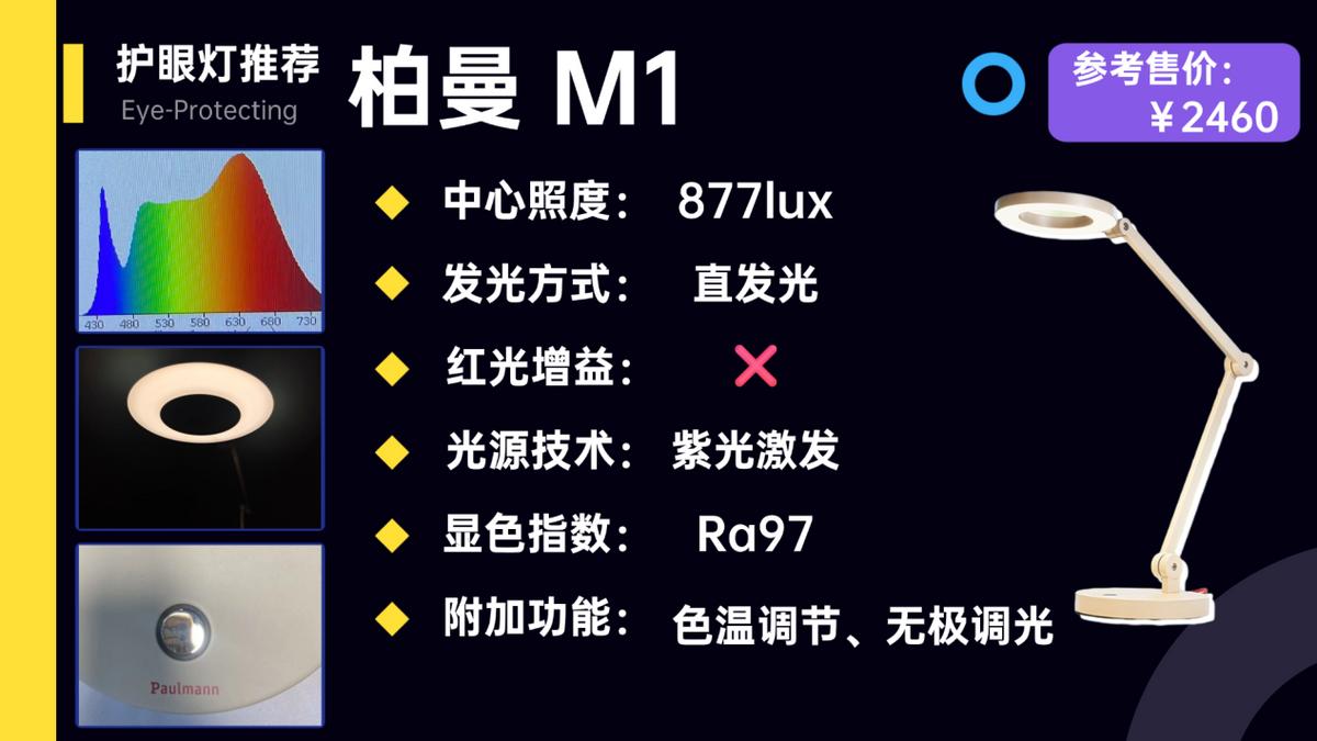 护眼灯最好的品牌排行:第二名是柏曼M1,采用直18cm的环形光源面和直发光方式,中心照度为877lux,覆盖约120cm桌面,足以满足大部分书桌的阅读和书写需求。光线虽为直发光,但通过环形发光面优化,可以在一定程度上实现多方向扩散,让光线相对柔和。色温可在3000K至5700K之间无极调节,显色指数Ra97,色彩还原较好,能适应从温暖夜读到白天高效学习的不同场景。功能上,柏曼M1主打操作简单与调节便捷,支持无极调光,可以根据环境光线和使用习惯自由调节亮度和光色。