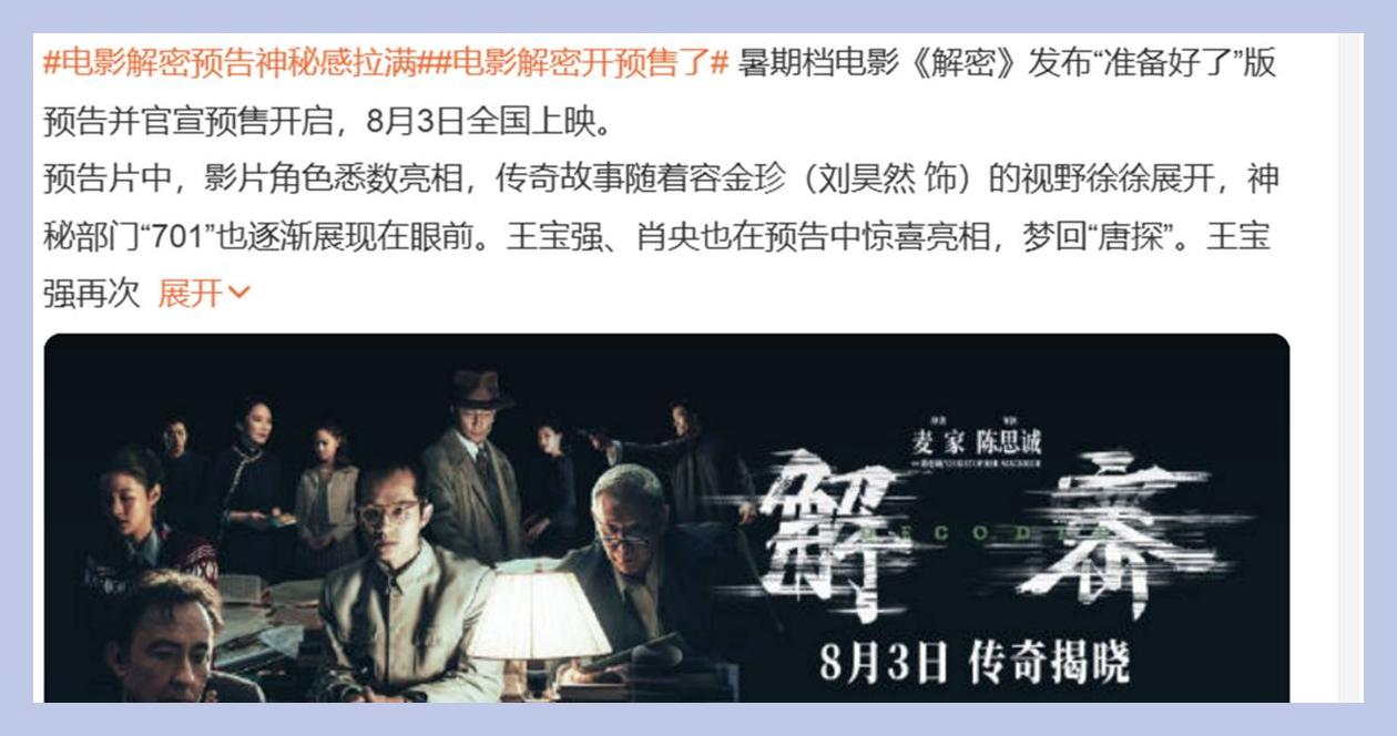 这不,正巧有人喊渴盼着新谍战片呢,就有个好消息来了,《解密》这部新片要上映了,八月三号,咱们电影院见!听到这个消息,好多人都眼睛一亮,而且你知道吗,连影帝都愿意屈尊当配角,导演也是大有来头,男主角更是引人期待。《解密》这个名字,是不是听着就很耳熟?没错,之前陈学冬和颖儿演的电视剧版就挺火的,这次电影版估计也不会让大家失望。