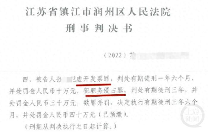 据上游新闻10月9日报道,出生于1987年的孙某曾任一家公司的财务经理,2021年9月因涉嫌职务侵占罪主动投案,10月被取保候审;2023年4月孙某又因虚开发票罪、职务侵占罪,被镇江市润州区人民法院判处有期徒刑三年六个月,并处罚金四十万元。2024年5月,二审维持原判。
