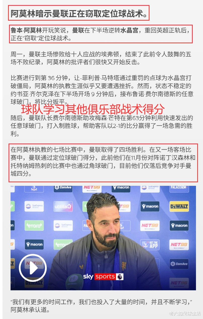 曼联上场比赛踢赢了水晶宫之后,阿莫林在赛后的新闻发布会上表态他们偷学了其他球队的优势来得分,并趁着水晶宫3天2赛的疲惫取得了胜利。