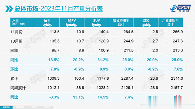 11月新能源乘用车生产98.9万辆,同比增长37.3%,环比增长7.2%;今年以来累计生产783.5万辆,同比增长32.4%。11月新能源乘用车批发销量达到96.2万辆,同比增长31.5%,环比增长8.2%;今年以来累计批发777.7万辆,同比增长35.2%。11月新能源车市场零售84.1万辆,同比增长39.8%,环比增长8.9%;今年以来累计零售680.9万辆,同比增长35.2%。
