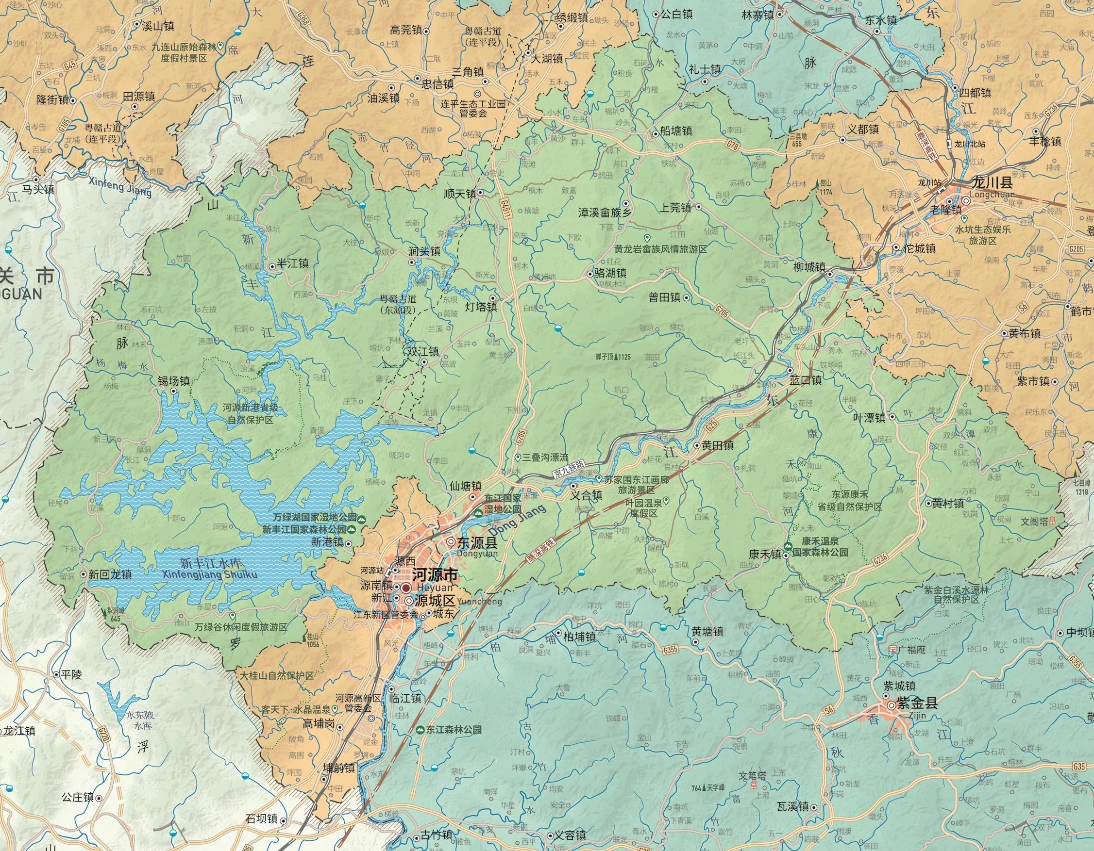 含“水”量最高的县域东源县是广东含“水”量最高的县域,因为新丰江水库这个广东最大的水库,几乎全境位于该县境内。